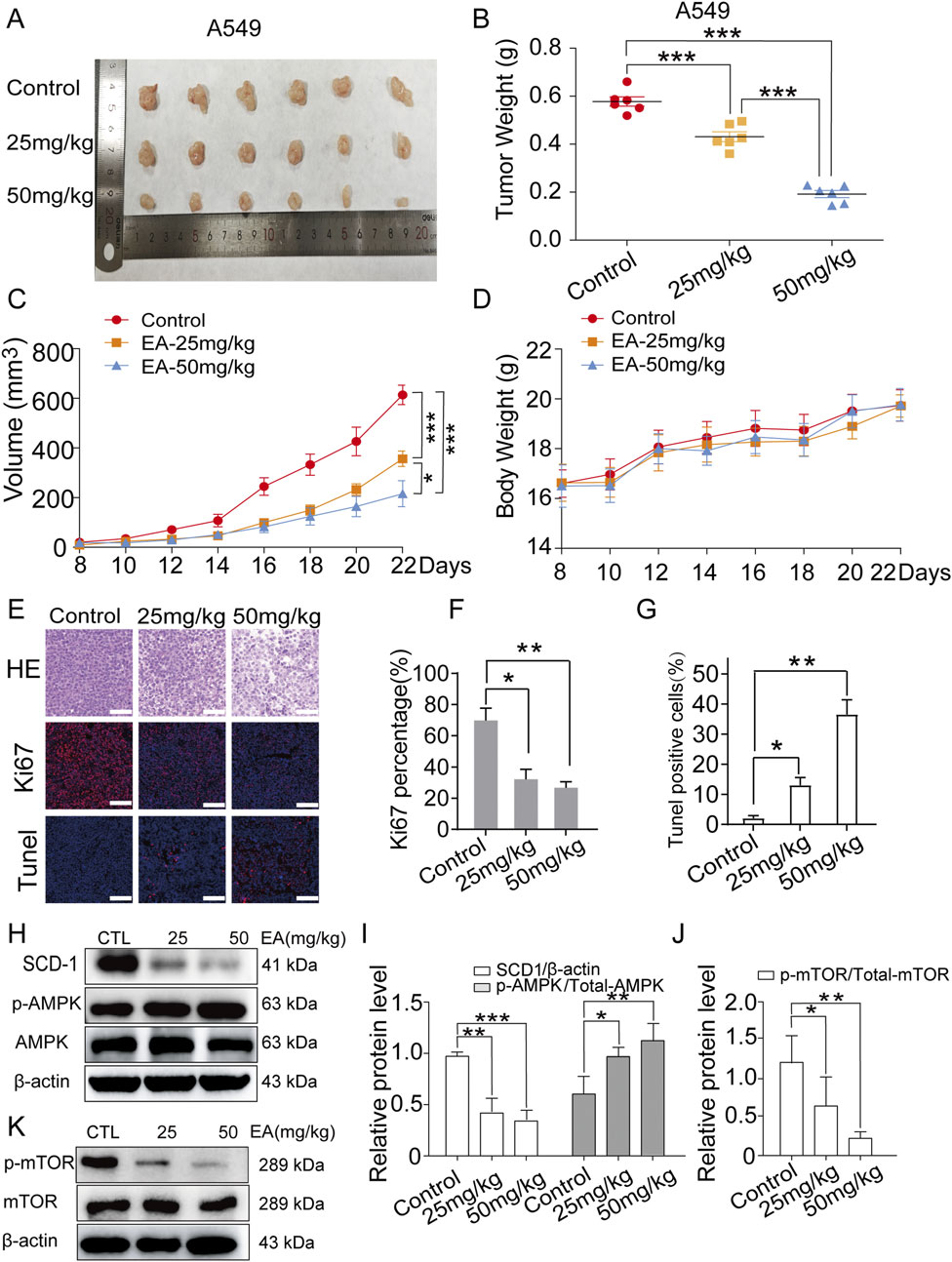 Figure 10. EA suppresses tumor growth in xenograft model of human non-small cell lung cancer cells. (A) Photograph of tumors from indicated mice. (B) Tumor weight of indicated mice. (C) Tumour volume of indicated mice. (D) Body weight of indicated mice. *p < 0.05, **p < 0.01, and ***p < 0.001 compared with the Control group. (E) H&E, Ki67 and TUNEL staining in indicated tumours. Scale bar = 50 μm. (F,G) Quantitative image analysis of Ki67 and Tunel positive cells in (E). (H–K) Western blot assay of phosphorylation protein expression of SCD1, AMPK and mTOR in indicated tumours n = 3. *p < 0.05, **p < 0.01, and ***p < 0.001 compared with the Control group.