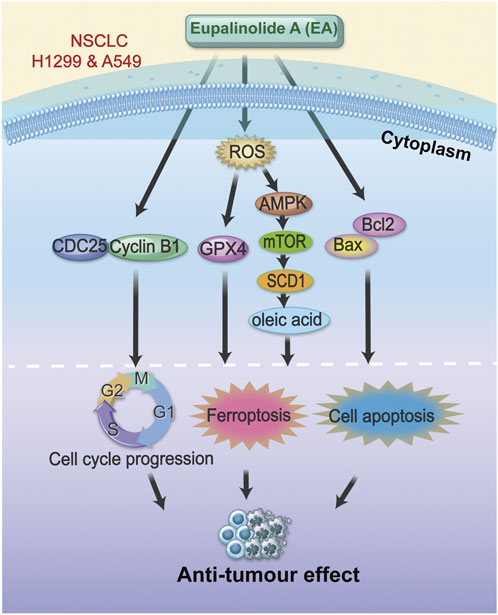 Diagram illustrating the mechanism of Eupalinolide A (EA) on NSCLC cell lines H1299 and A549. EA affects various pathways: ROS influences CDC25, Cyclin B1, GPX4, and Bcl2, leading to cell cycle progression and apoptosis. AMPK activates mTOR and SCD1, promoting oleic acid production and ferroptosis. These processes collectively result in an anti-tumor effect within the cytoplasm.