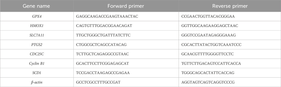 Cells were lysed using RIPA buffer (Beyotime, China). The lysate was heated at 100 °C for 5 min. Proteins were separated by 10% SDS-PAGE gel, ensuring high resolution and accuracy. Then, proteins were transferred onto a polyvinylidene difluoride membrane. The membrane was incubated in 5% milk for 2 h to block non-specific binding sites. The membrane was incubated with the following primary antibodies at 4 °C for 12 h: CDC25C (Proteintech; 1:1,000; cat. no. 66912-1), cyclin B1 (Proteintech; 1:1,000; cat. no. 67686-1), BAX (Proteintech; 1:1,000; cat. no. 60267), SCD-1 (Proteintech; 1:1,000; cat. no. 28678), GPX4 (Abcam; 1:1,000; cat. no. ab125066), HO-1 (Abcam; 1:1,000; cat. no. ab13248), SLC7A11 (CST; 1:1,000; cat. no. 12691S), PTGS2/COX2 (Abways; 1:1,000; cat. no. CY8852), BCL2 (Abways; 1:1,000; cat. no. CY5032), p-AMPK (Abclonal; 1:1,000; cat. no. APO871), AMPK (Abclonal; 1:1,000; cat. no. A1229), p-mTOR (CST; 1:1,000; cat. no. 5536T), mTOR (Immunoway; 1:1,000; cat. no. YT2913), and β-actin (Zhongshan Goldenbridge Bio; 1:1,000; cat. no. TA-09). Next, the membrane was incubated with HRP-conjugated secondary antibodies (A0216 and A0208, Beyotime; 1:1,000) for 2 h at 37 acy. inally, proteins were visualized using an ECL system (Biorad, USA). The expression of CDC25C, cyclin B1, BAX, SCD-1, GPX4, HO-1, SLC7A11 and BCL2 was normalized to t. no. T.