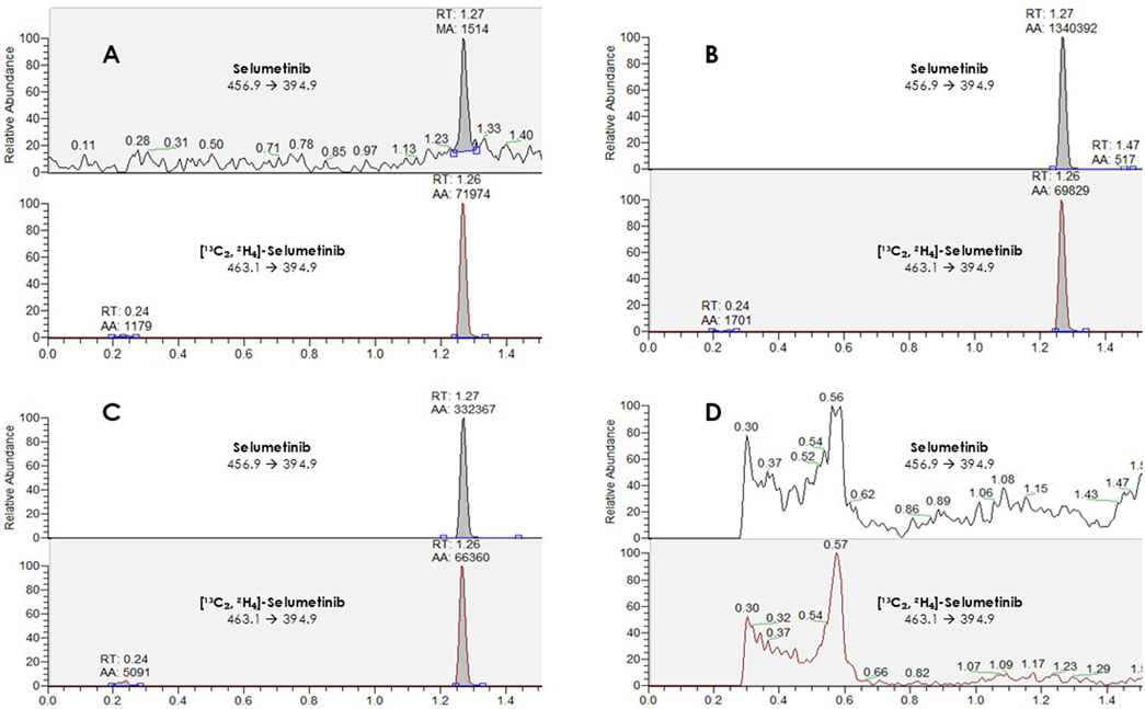 Selectivity was assessed using plasma samples from six healthy donors. Each lot was analyzed both as unspiked and spiked with selumetinib at the LLOQ (1.3 ng/mL). Interference from endogenous compounds was considered acceptable if the response in unspiked samples did not exceed 20% of the LLOQ signal for selumetinib and 5% of the IS response.