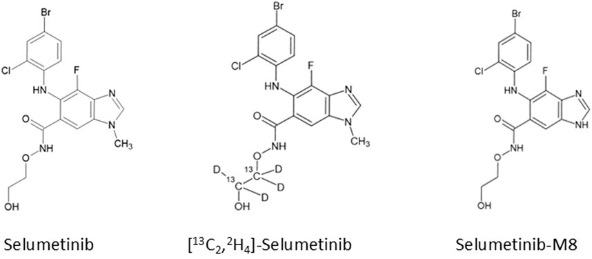 Chemical structures of selumetinib, its IS [13C2,2H4]-selumetinib, and the active metabolite M8 are shown in Figure 5.
