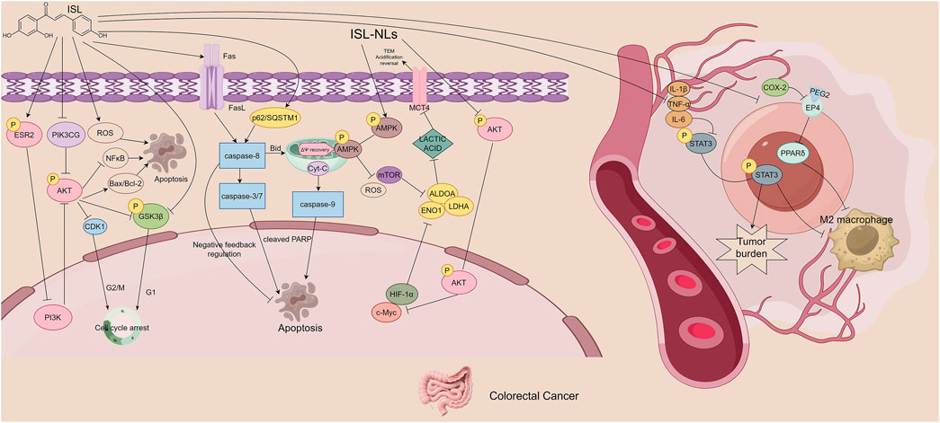 Colorectal cancer (CRC), a highly prevalent malignancy of the digestive system, ranks among the leading causes of cancer-related mortality worldwide (Sears and Garrett, 2014). The progression of CRC involves the synergistic regulation of various molecular mechanisms. For example, the PI3K/AKT signaling pathway plays a pivotal role in CRC cell proliferation and migration (Maharati and Moghbeli, 2023), while AMPK suppresses lactate production in CRC cells (Xiao et al., 2017). ISL has demonstrated multifaceted antitumor effects against CRC, involving the modulation of inflammation, signaling pathways, metabolic reprogramming, gut microbiota, and apoptosis.