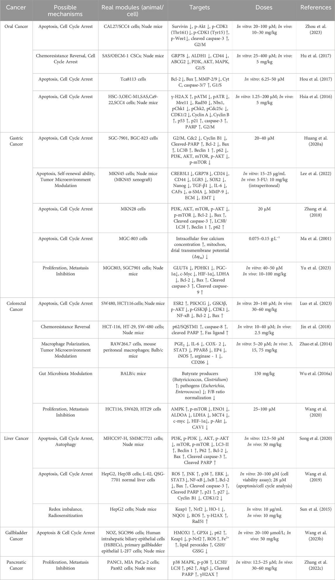ISL has demonstrated potent anticancer activity against a variety of digestive system malignancies through modulation of multiple molecular pathways. These effects are mediated via the regulation of apoptosis, autophagy, cell cycle arrest, redox homeostasis, and tumor microenvironment (TME) remodeling. The following sections provide a detailed overview of the specific mechanisms by which ISL exerts its therapeutic effects in distinct types of digestive system cancers, including oral, gastric, colorectal, hepatic, gallbladder, and pancreatic cancers (Table 1).