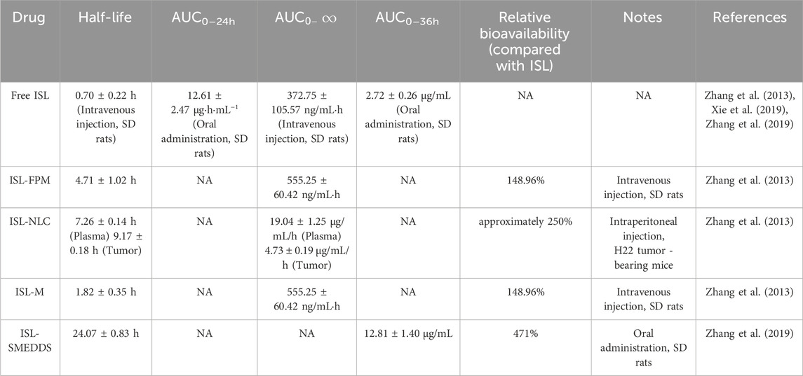 ISL formulations have not entered early clinical trials for two reasons: metabolic uncertainties and interspecies differences (ISL has high absorption but low bioavailability in rats (Lee et al., 2013), making animal parameters inapplicable to humans); and insufficient quality control and stability (nanoformulations lack evaluation, e.g., ISL-LP stability unestablished (Song et al., 2024), impeding translation).