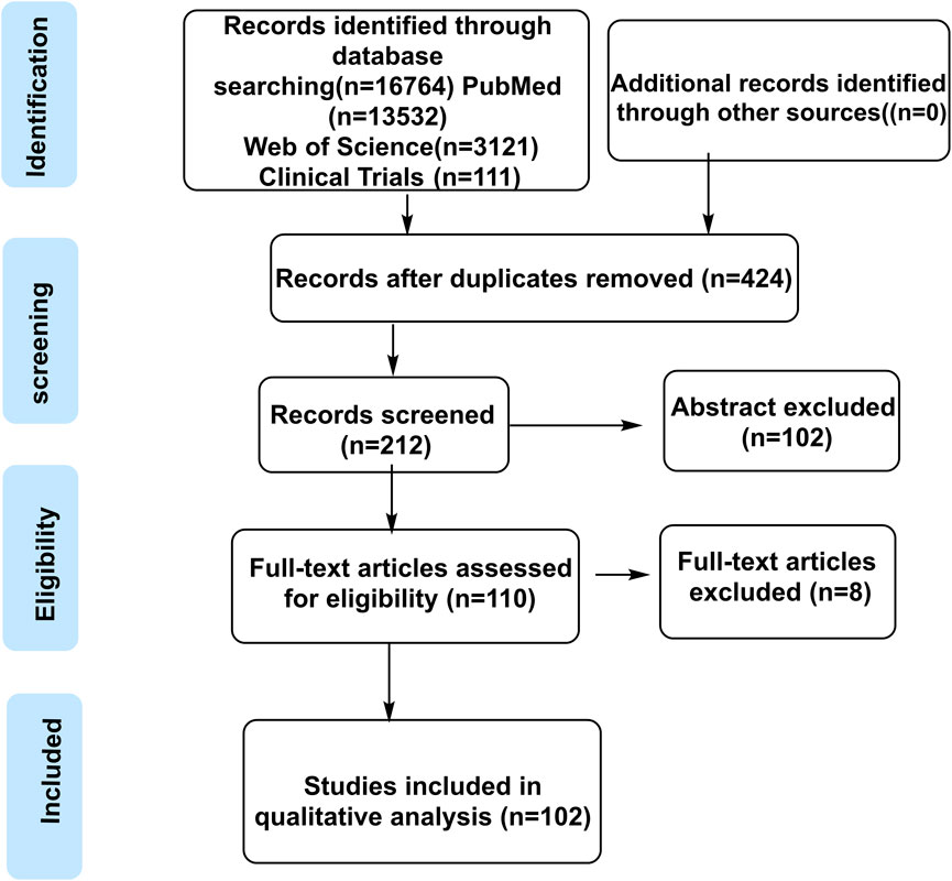 A total of 102 references were screened (final inclusion number to be updated by 2025). Panax ginseng C.A. Mey. (Latin name: P. ginseng C.A. Mey.), a perennial medicinal and edible plant, belongs to the genus Panax within the family Araliaceae. Taxonomic nomenclature and species illustrations were validated against authoritative sources, including Flora of China (1994) and The World Flora Online (http://www.worldfloraonline.org, accessed 10 March 2025), with chemical structure data sourced from PubChem and visualized using ChemDraw software. The literature retrieval flowchart is presented in Figure 1.