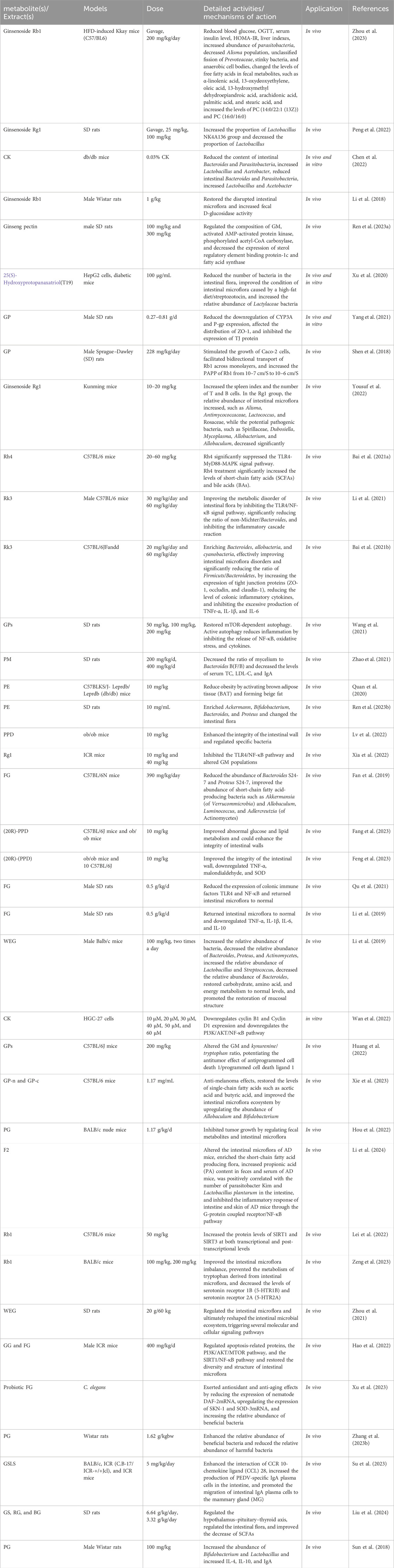 Ginsenoside Rb1 exerts multifaceted anti-diabetic effects through its potential prebiotic properties, which regulate specific intestinal microbiota and their metabolites, which are key contributors to diabetes-related metabolic disorders and insulin resistance. In diabetic Kkay mice, Rb1 significantly reduces blood glucose levels, improves oral glucose tolerance test (OGTT) performance, decreases serum insulin levels and homeostasis model assessment of insulin resistance (HOMA-IR) index, lowers hepatic index, alleviates pancreatic injury, reverses GM dysbiosis, and modulates fecal free fatty acid profiles (Zhou et al., 2023). Similarly, Rg1 demonstrates multifaceted anti-diabetic activities: in high-fat diet (HFD)- and streptozotocin (STZ)-induced T2DM rats, it significantly reduces blood glucose levels, improves insulin sensitivity, attenuates oxidative stress and inflammation, normalizes blood lipid profiles, and positively modulates intestinal microbial composition (Peng et al., 2022). As the primary circulating metabolite of PG in serum, CK not only confers renal protection but also modulates GM composition and downregulates the expression of TLR4 signaling pathway proteins induced by imidazole propionate (Chen et al., 2022). In male Wistar rats, ginsenoside Rb1 exhibits significant hypoglycemic activity via a specific metabolic pathway (Rb1→Rd→F2→CK), where the bioconversion rate of CK increases from 14.0% to 86.7% following 8 h of incubation. Ginseng pectin (GPS) synergizes with Rb1 to restore GM homeostasis and increase fecal D-glucosidase activity, thereby exerting potent anti-diabetic effects (Li et al., 2018). GPS treatment further ameliorates hyperglycemia, hyperlipidemia, and hepatic steatosis in T2DM rats by activating AMP-activated protein kinase (AMPK) and promoting the phosphorylation of acetyl-CoA carboxylase, which subsequently reduces the expression of sterol regulatory element binding protein-1c (SREBP-1c) and fatty acid synthase (FAS) (Ren et al., 2023a). Additionally, 25-hydroxy-protopanaxatriol (T19), a novel ginsenoside derivative derived from PG, inhibits α-glucosidase and protein tyrosine phosphatase 1B (PTP-1B) in vitro. These inhibitory effects, combined with T19’s ability to modulate glucose and lipid metabolism via beneficial bacterial interactions, effectively reduce blood glucose and lipid levels, increase insulin sensitivity, and ameliorate hepatic and pancreatic histopathology (Xu et al., 2020).