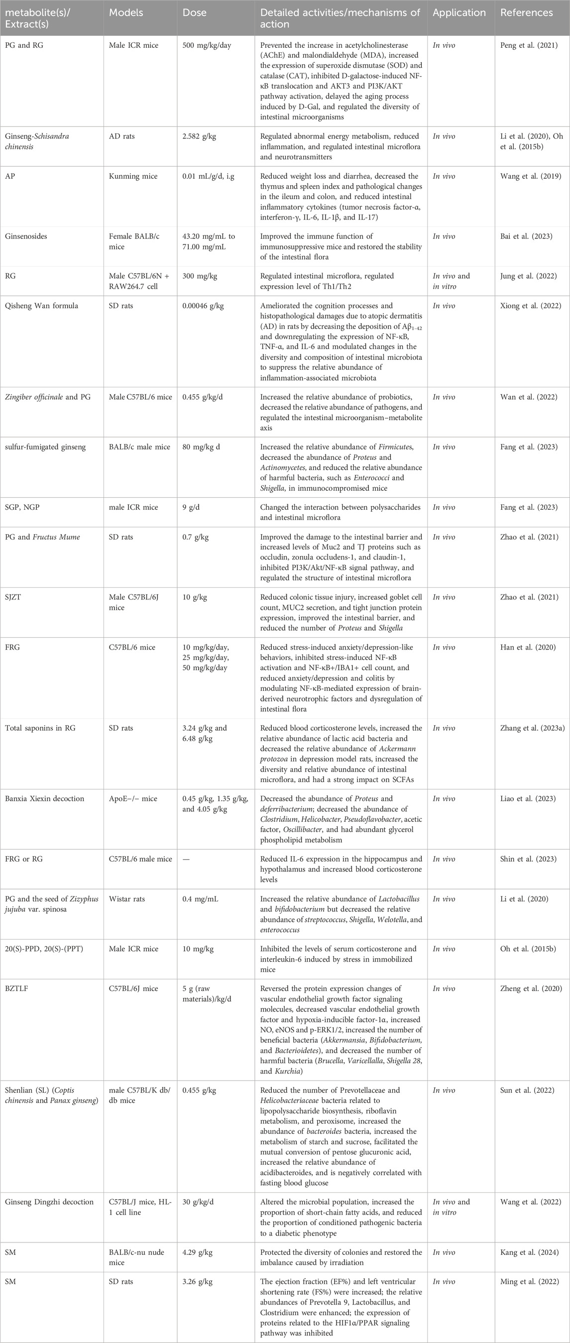 Numerous studies have demonstrated that PG, ginsenosides, and GPs exert potential therapeutic effects on various other diseases. In male Wistar rats with spleen deficiency syndrome, co-administration of PG and wild jujube upregulated the relative abundances of Firmicutes, Bacteroidetes, Lactobacillus, and Bifidobacterium, while reducing the relative abundances of Actinobacteria, Proteobacteria, Streptococcus, Escherichia, Shigella, Veillonella, and Enterococcus. This modulation reversed the pathological state of GM imbalance associated with spleen deficiency (Li et al., 2022).