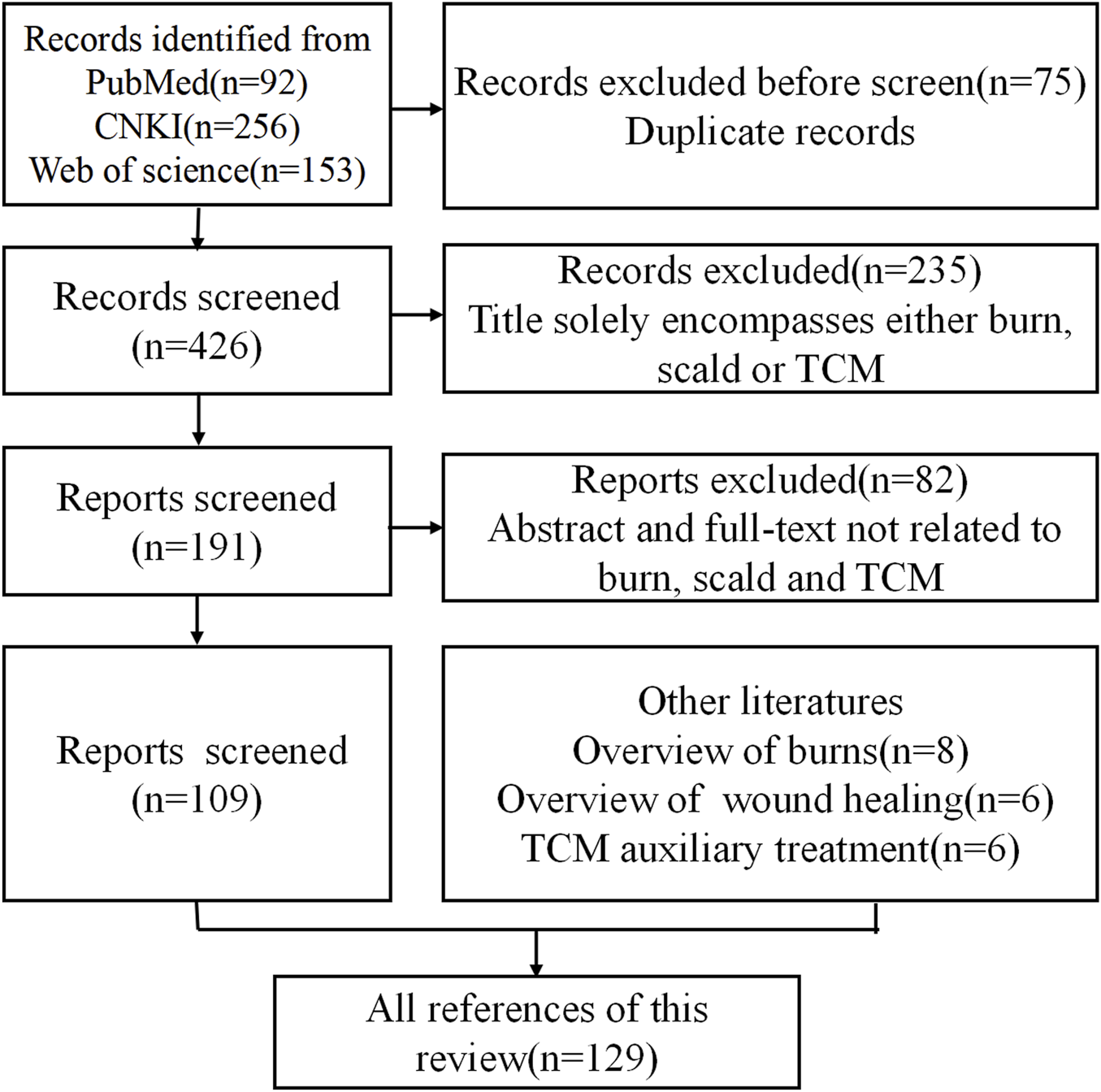 To address this research gap, a systematic and comprehensive literature review was conducted to evaluate the current application of TCM in burn treatment. The literature search was performed across multiple electronic databases, including PubMed, CNKI, and Web of Science. The search strategy utilized the following keyword clusters: (“traditional Chinese medicine” OR “phytochemistry” OR “herbs”) AND (“burn” OR “scald” OR “skin wound”). The scientific nomenclature of medicinal plants was verified using “The Plant List” (www.plantsoftheworldonline.org). The initial search yielded 92 records from PubMed, 256,153 from CNKI, and an unspecified number from Web of Science. After importing all records into EndNote literature management software (https://endnote.com/), 75 duplicates were removed. The remaining articles underwent a two-stage screening process based on the following criteria: Inclusion Criteria: Studies focused on the use of TCM compounds, single herbs, or active ingredients in the treatment of burns, scalds, or skin wounds. Articles published in peer-reviewed journals within the past 30 years. Reports available in either English or Chinese. Studies involving in vitro, in vivo, or clinical evaluations. Exclusion Criteria: Publications not relevant to TCM or burn treatment (e.g., veterinary use, non-therapeutic research). Non-original research articles such as editorials, commentaries, or conference abstracts without full text.