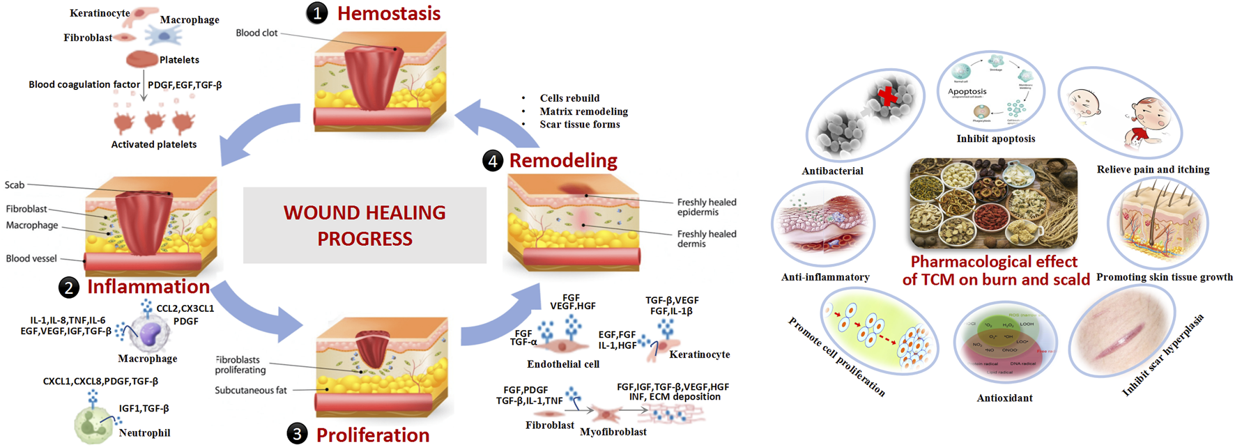 Chinese herbal medicine and natural products are widely recognized for their efficacy, low side effects, and minimal resistance development in treating burns. The healing process of burn wounds is highly complex, involving growth factors, inflammatory mediators, and ECM remodeling. TCM exerts its therapeutic effects through multi-component, multi-target, and multi-pathway mechanisms. Experimental studies have demonstrated that products used in TCM can enhance the production and secretion of growth factors, including VEGF and EGF. Additionally, they have been shown to reduce the expression of pro-inflammatory cytokines such as interleukin-6 (IL-6) and tumor necrosis factor-alpha (TNF-α), inhibit bacterial proliferation, improve immune function, and regulate collagen synthesis along with ECM remodeling. Furthermore, TCM-based treatments exhibit antioxidant properties, eliminate free radicals, facilitate cell proliferation, inhibit apoptosis, and provide analgesic and antipruritic effects.