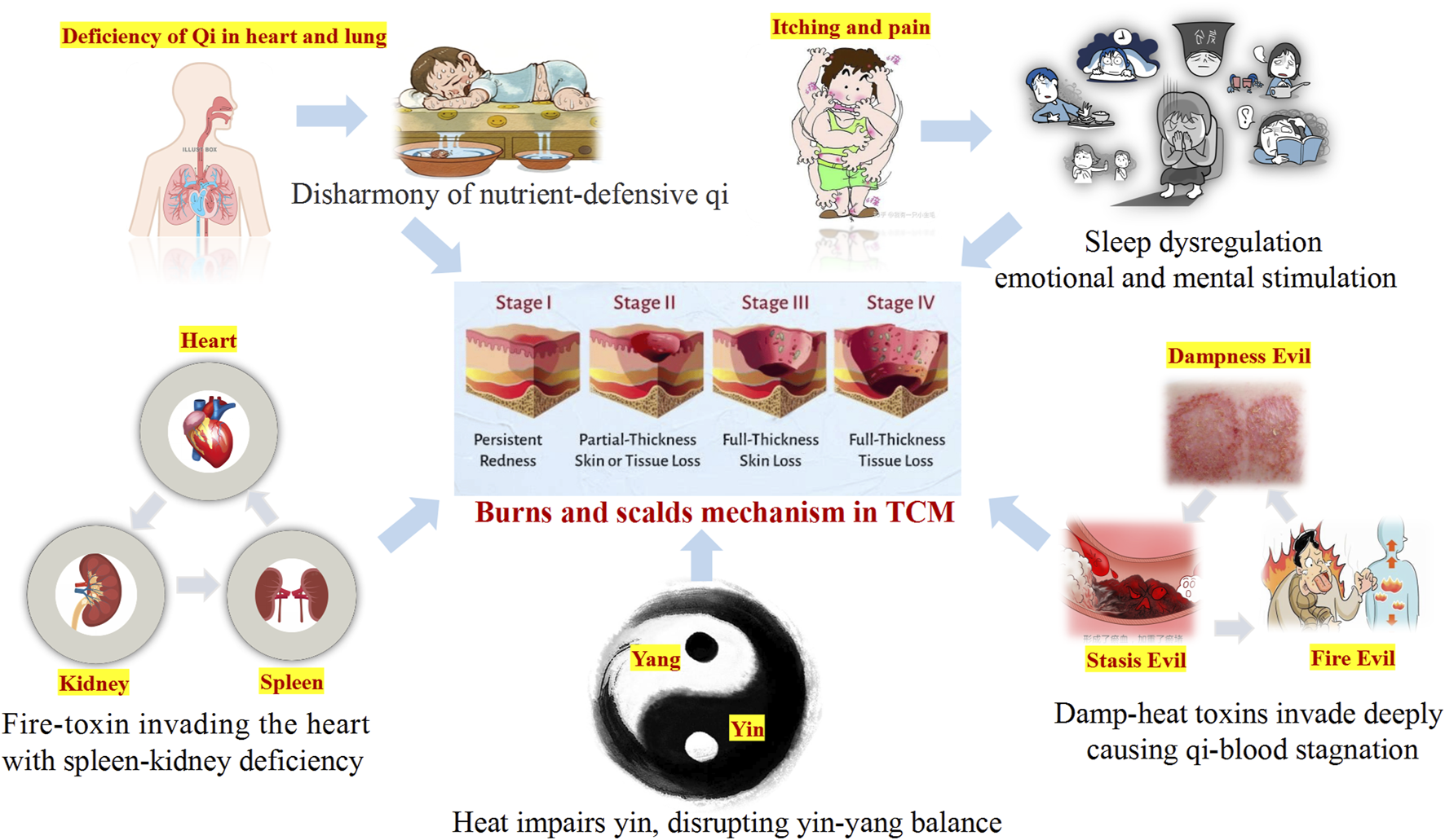 In TCM, burn injury is collectively referred to as “water and fire burns”. It occurs when the skin and deeper tissues are exposed to high temperatures, leading to Qi and blood stagnation and an imbalance between defensive (Wei) Qi and nourishing (Ying) Qi. The pathogenesis involves heat acting on the superficial muscles, causing local Qi stagnation and meridian obstruction. This weakens the Wei Qi, the body’s first line of defense, reducing its protective function and resulting in fluid leakage, blister formation, and exudate (Que et al., 2005). Excessive blistering may deplete Yin fluids, eventually leading to Yin deficiency, Yang collapse, and an imbalance between Yin and Yang (Ripszky Totan et al., 2022). Furthermore, the invasion of fire toxins can impair the functions of the spleen, kidney, and heart, exacerbating Qi stagnation. Sleep disorders in burn patients are closely associated with Yin-Yang imbalances and internal organ dysfunctions (Liang et al., 2021; Liu et al., 2023). In TCM, normal sleep relies on the harmonious coordination of Yin-Yang and mental tranquility. Disruptions in these factors or mental unrest can lead to sleep disturbances (O'Brien and Weber, 2016). Burn patients often experience severe nocturnal skin itching, which disrupts sleep and may result in neurasthenia or other health complications (Chung et al., 2020) (Figure 3).