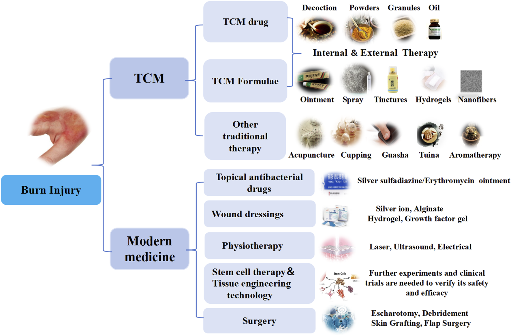 With the advancement of modern TCM, there is a growing body of theoretical and practical evidence supporting its use in burn treatment. TCM employs a holistic approach, utilizing single herbs (e.g., Rheum palmatum L.), Coptis chinensis Franch., Angelica sinensis (Oliv.) Diels) and compound prescriptions to address both systemic and local symptoms of burn injuries. Therapeutic methods include internal administration, which regulates systemic conditions and enhances the body’s resistance to pathogens, and external application, which directly targets the burn site to promote wound healing and prevent complications such as tissue necrosis, vascular occlusion, and infection. External medications, including ointments, sprays, and hydrogels, play a critical role in addressing local blood circulation disorders and controlling wound infections. Additionally, auxiliary TCM therapies such as acupuncture, cupping, guasha, tuina, and aromatherapy provide complementary benefits by improving blood flow, reducing pain, and enhancing overall recovery (Figure 4).