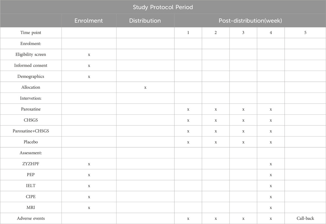 This study will be a blinded interventional trial with four parallel groups and a natural control group. The study will be conducted in accordance with the Declaration of Helsinki and follows the Consolidated Standards of Reporting Trials statement for randomized trials, as well as the Standard Protocol Items: Recommendations for Interventional Trials (SPIRIT). The trial has been registered with the International Traditional Medicine Clinical Trial Registry (Registration No. ITMCTR2025000309) and Ethics Committee of Chongqing Hospital of Traditional Chinese Medicine (Registration No. 2023-ky-87), and will be proceeded in the Departments of Urology and Radiology at Chongqing Traditional Chinese Medicine Hospital in Chongqing, China. According to the minimum requirements for network analysis of functional neuroimaging studies, 15 subjects were needed in each group, and 21 subjects were included in each group to ensure the credibility of the study results, taking into account the unavailability of data due to patient dropout and head movement during scanning (Desmond and Glover, 2002). Through previous studies and in combination with the actual situation of the project (Rodríguez Del Águila and González-Ramírez, 2014), a total of 84 subjects were included in this study, and they will be equally divided into the following four groups: paroxetine group; CHSGS group; CHSGS + paroxetine group; placebo group. In addition, we will recruit 15 healthy volunteers as natural control group (Figure 1).