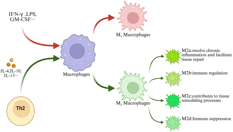 Based on their induction mechanisms and functional differences, M2 macrophages can be further classified into four subtypes: M2a (wound-healing type, induced by IL-4/13, secretes anti-inflammatory cytokines such as IL-10 and TGF-β, promoting repair), M2b (regulatory type, induced by immune complexes or TLR agonists, exerting immunoregulatory functions), M2c (deactivated type, induced by IL-10/TGF-β, involved in tissue remodeling), and M2d (tumor-associated type, activated by growth factors, possessing immunosuppressive properties) (Asmis, 2016; Yue et al., 2017; Smigiel and Parks, 2018; Anders et al., 2022; Hung et al., 2024; Cutolo et al., 2025) (Figure 1).