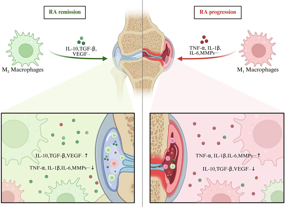 Figure 2. The relationship between M1/M2 macrophage polarization balance and RA. Abbreviations: Overactivation of M1 macrophages results in excessive production of pro-inflammatory cytokines, which exacerbates synovial inflammation and joint bone erosion. Conversely, insufficient M2 polarization fails to suppress inflammation effectively or promote tissue repair.