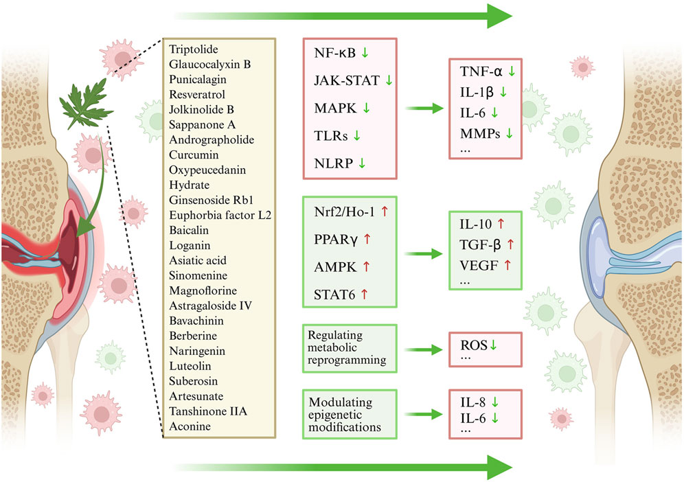 Resveratrol, a naturally occurring polyphenol, exhibits anti-inflammatory effects; studies have demonstrated that it inhibits M1 polarization by downregulating the JAK1-STAT1/STAT3 pathway and deacetylating NF-κB p65, thereby reducing the secretion of proinflammatory mediators including IL-6 and IL-12, ultimately relieving synovitis in animal models (Oliveira et al., 2017; Wang P. et al., 2024). Jolkinolide B (JB), a diterpene metabolites isolated from Euphorbia pekinensis Rupr., in plant, exhibits anticancer, anti-inflammatory, and antituberculosis properties. Research has demonstrated that JB markedly decreases arthritis scores and synovial hyperplasia in CIA rats by inhibiting the JAK2/STAT3 signaling pathway and reducing inflammatory cytokine levels. It efficiently antagonizes M1 polarization, thereby alleviating inflammation and preventing bone erosion in CIA models (Yan et al., 2024). The mechanism involves JB suppressing mRNA expression of inflammatory cytokines in the ankle joints of CIA rats and reducing their levels in LPS-stimulated RAW264.7 macrophages, effectively inhibiting M1 polarization and significantly downregulating JAK2/STAT3 protein expression. Sappanone A (SA), an active plant metabolites of Tamarindus indica L., possesses anti-inflammatory, antioxidant, and bone-protective properties. Research has shown that SA can downregulate the protein phosphorylation levels of JAK2, STAT3, PI3K, AKT, and p65 in vivo and in vitro, and reverse the increase in protein phosphorylation levels of PI3K/AKT/NF-κB and JAK2/STAT3 pathway-related proteins induced by agonists, thereby reducing the levels of pro-inflammatory cytokines TNF-α, IL-1β, IL-6, and IL-17. While promoting the levels of the anti-inflammatory cytokine IL-10, inhibiting M1 polarization while promoting M2 polarization, thereby significantly reducing the arthritis index in CIA rats, alleviating paw swelling, and improving inflammatory cell infiltration and cartilage degradation (Deng et al., 2024). Nevertheless, these conclusions largely stem from in vitro and animal experiments, with the mechanisms of action yet to be fully elucidated. Their clinical translation and real-world efficacy in humans demand further confirmation in rigorous randomized controlled trials. While JAK-STAT inhibitors are already in clinical use, metabolites from plants, with their multi-target characteristics, may provide superior safety. Further attention should be directed toward their potential synergy with current therapies and their long-term safety profile.