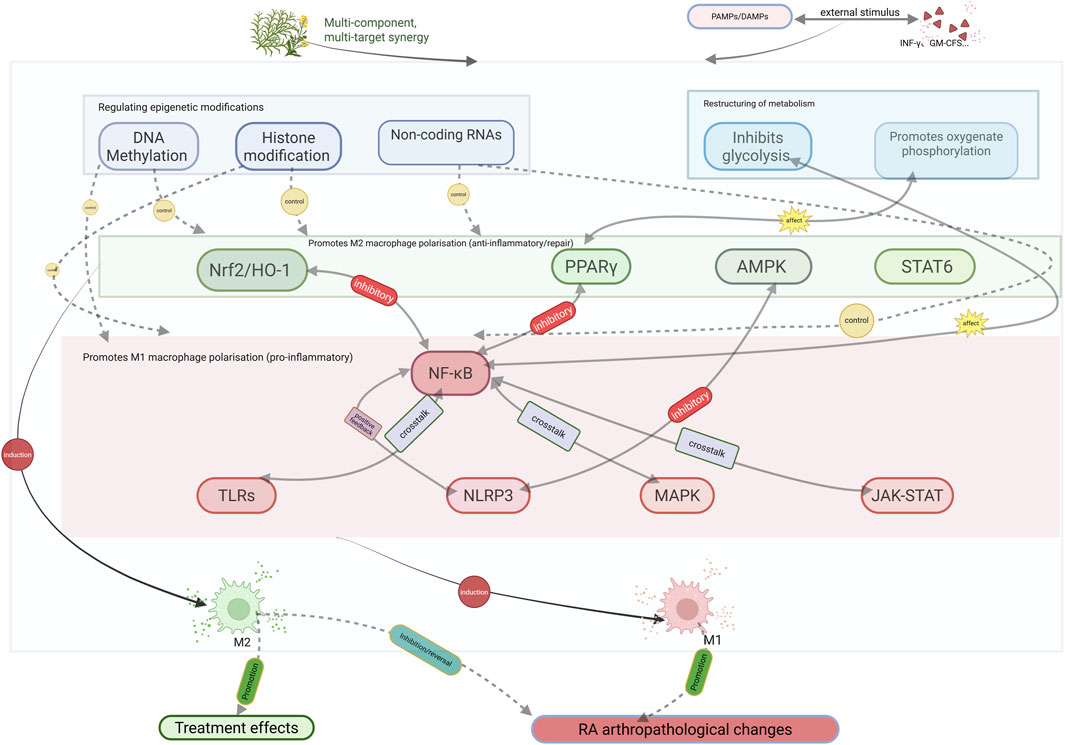 Lin et al. (2023) demonstrated that the main plant metabolites of the traditional Chinese formula Wutou Decoction (aconitine, astragaloside IV, ephedrine, paeoniflorin, and glycyrrhizic acid) can act in combination to modulate the NF-κB/PPARγ pathway, rebalance M1/M2 polarization, and ameliorate synovial inflammation in RA. According to Peng et al. (2019) enhancing M2 macrophage polarization inhibits inflammatory responses and reduces joint injury. JAK inhibitors, such as tofacitinib, reshape macrophage balance by inhibiting M1-associated IFN-γ–STAT1 signaling while preserving M2-related IL-4–STAT6 pathways, leading to significant improvement of RA symptoms (Fleischmann et al., 2023). Therefore, promoting the transition from M1 to M2 phenotypes has emerged as a novel therapeutic strategy for RA, with significant clinical potential (Figure 2).