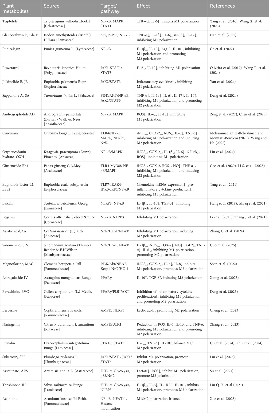 Table 1. Representative plant metabolites regulating M1/M2 macrophage polarization and their mechanisms.