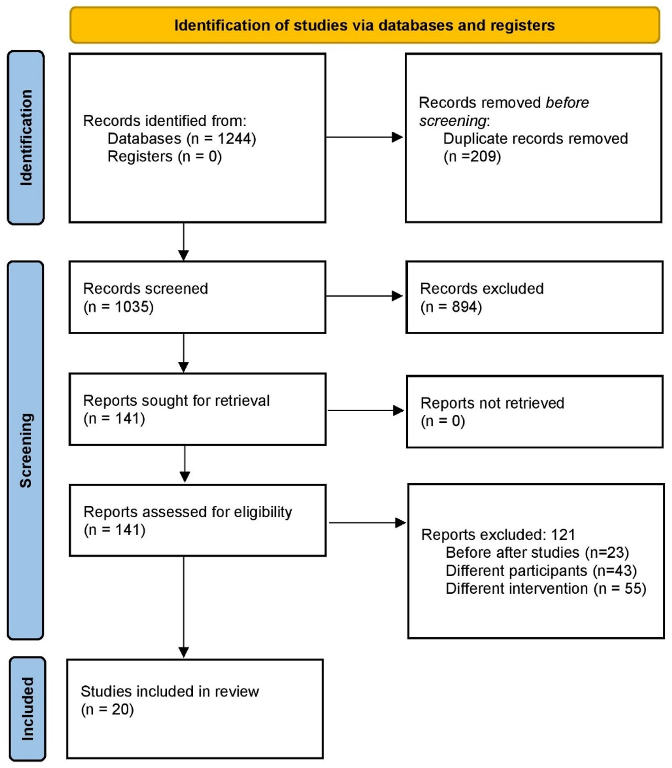 Flowchart summarizing the systematic screening process of identified records through database searching, title/abstract screening, full-text assessment, and final inclusion in qualitative and quantitative synthesis (n = 20 studies).