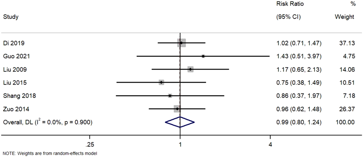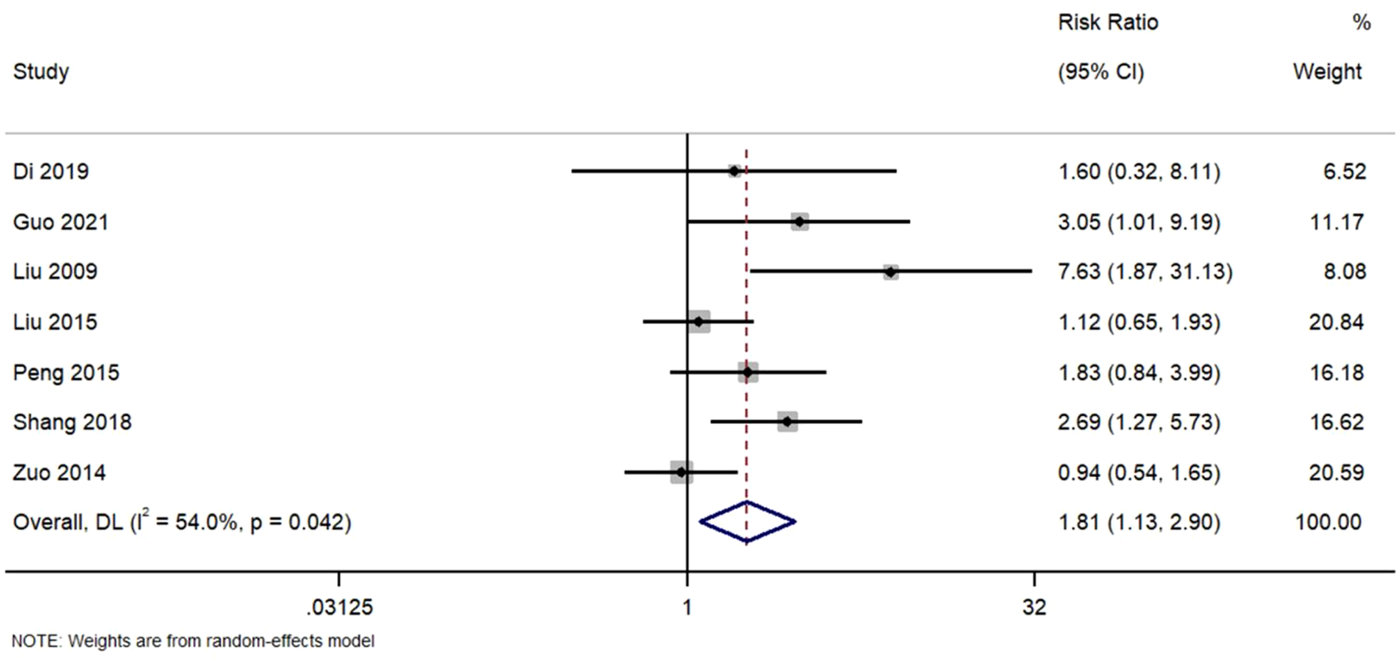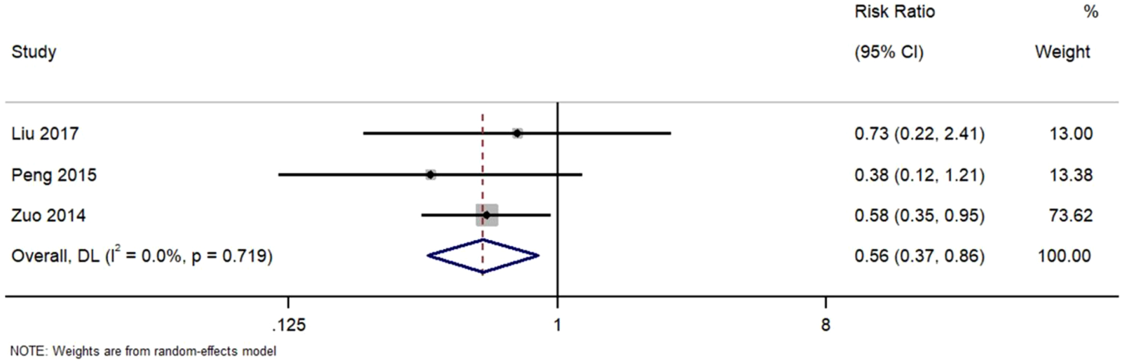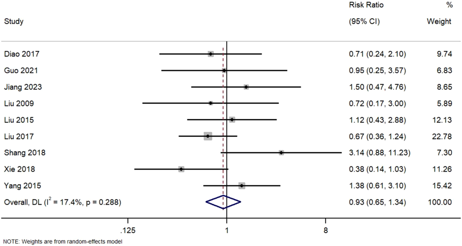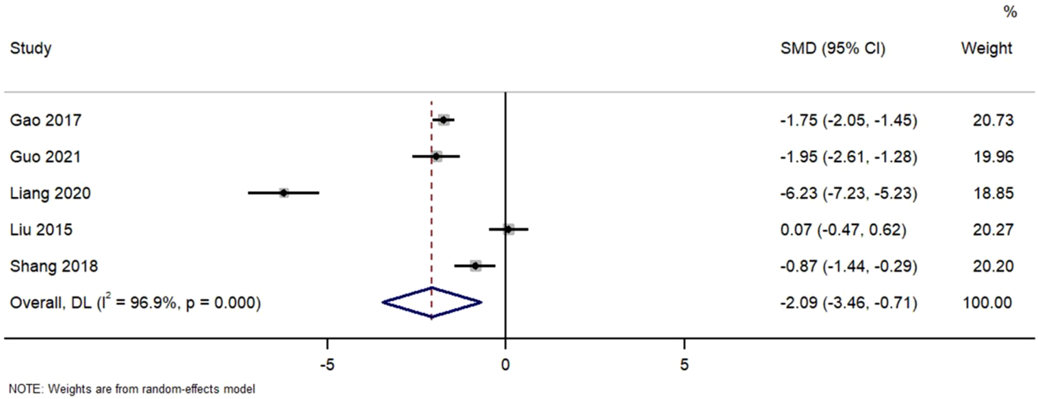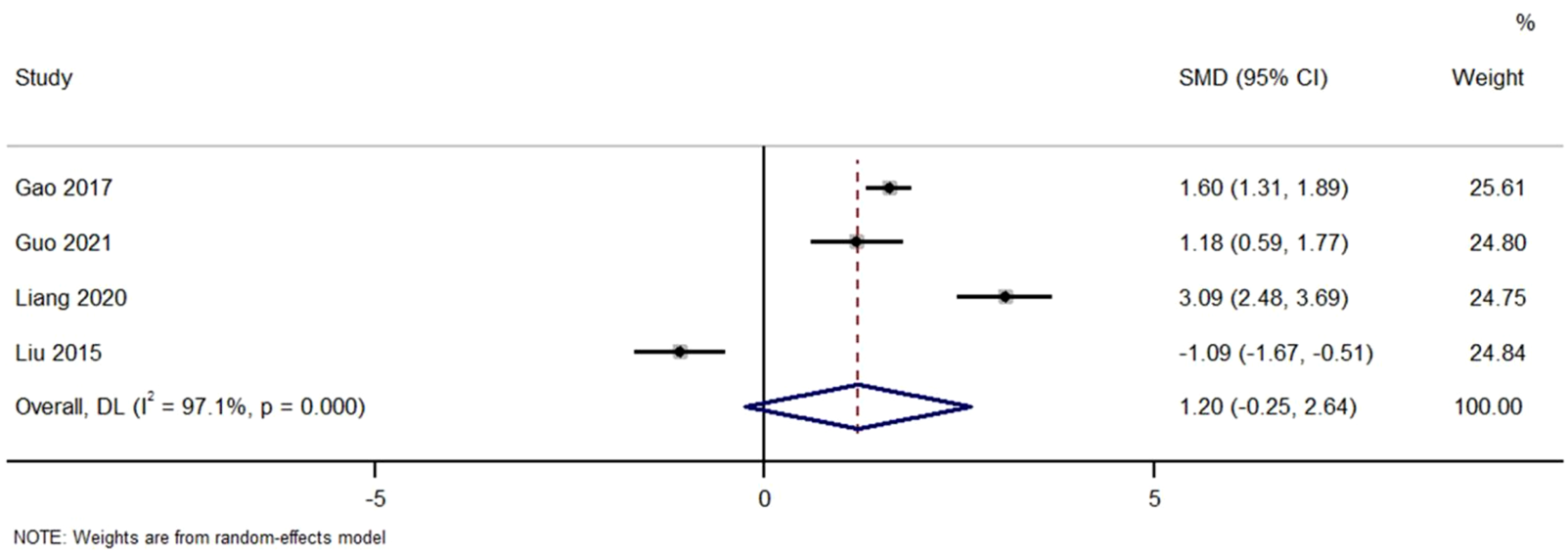 All meta-analyses were performed using Stata software, version 14.2 (StataCorp, College Station, TX, United States of America). A random-effects inverse-variance model was employed for all pooled analyses to account for the anticipated clinical and methodological heterogeneity among the included studies. Treatment effects for dichotomous outcomes were expressed as risk ratios (RR) with 95% confidence intervals (CIs), while continuous outcomes were expressed as standardized mean differences (SMD) with 95% CIs. The Mantel-Haenszel method was used to pool RRs, and the inverse-variance method was used for SMDs.