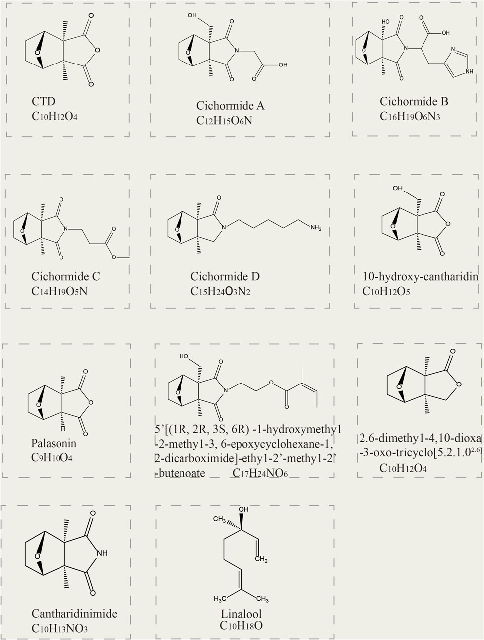 Mylabris also contains various peptides, including ring-(L-proline-L-alanine), ring-(R-proline-R-leucine), ring-(S-proline-R-leucine), and ring-(D-proline-L-tyrosine); nucleosides such as uracil, uridine, and hypoxanthine; aromatic compounds such as indole-3-aldehyde, indole-acetic acid, 2-piperidone, 4-hydroxyphthalid (Zeng et al., 2016), 3-phenyl-4-aza-fluorene, phenylacetaldehyde (Liu et al., 2013), and p-hydroxybenzoic acid. With the advances in modern science and technology, more components of mylabris could be discovered and serve as valuable references for its quality control.