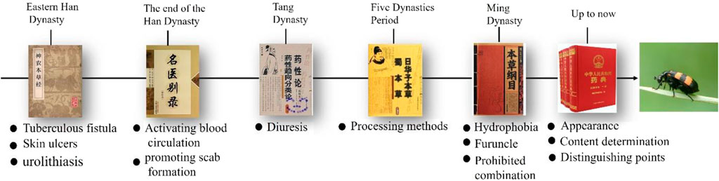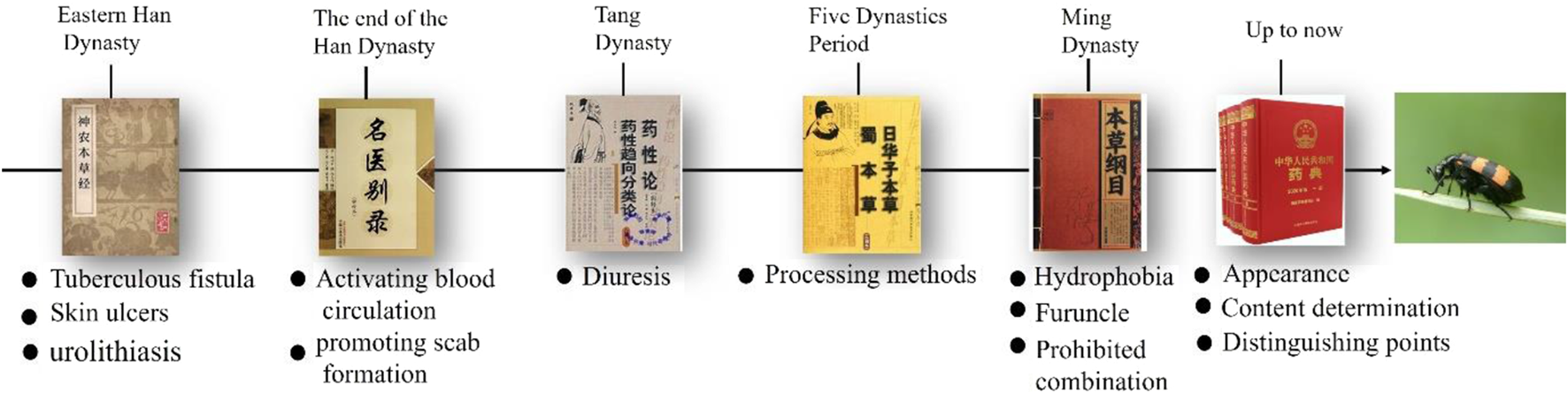 Mylabris has been documented in the material medica of different dynasties in China (Figure 2). Mylabris was originally recorded in the Shennong Materia Medica as an inferior-grade drug to treat tuberculous fistula, skin ulcers, and urolithiasis. It is also noted that mylabris should not be used in combination with Croton tiglium L. or Salvia miltiorrhiza Bunge. During the Wei and Jin dynasties, its use for activating blood circulation, promoting scab formation, and inducing abortion was documented in the Ming Yi Bie Lu. In the Tang dynasty, it was used for diuresis, as recorded in the Yao Xing Lun. In the Five dynasties period, processing methods such as the removal of wings, feet, and frying were documented in the Ri Hua Zi Ben Cao to prevent vomiting and diarrhea. In the Ming dynasty, mylabris was used to treat hydrophobia, furuncle, and neuralgia, and it was noted that this drug should not be used with Glycyrrhiza uralensis Fisch. To date, the efficacy and applications of mylabris have been detailed and revised in the China Pharmacopoeia, which details its appearance and shape, physicochemical characteristics, dosage and administration (Li and Chen, 2025).