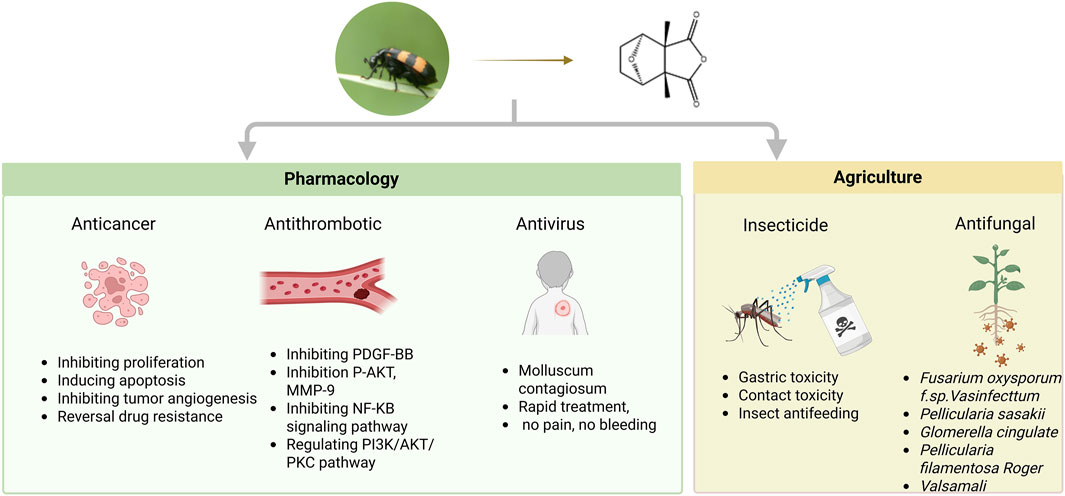 Extensive studies have been conducted to determine the biological activities and pharmacological effects of mylabris extracts, particularly CTD. The currently reported activities of CTD include anticancer (Deng et al., 2013), antithrombotic (Viallard and Larrivée, 2017), antiviral (Braue et al., 2005), insecticidal, and antifungal effects (Eisner et al., 1974). Next, the pharmacological effects of CTD are summarized in Figure 3.