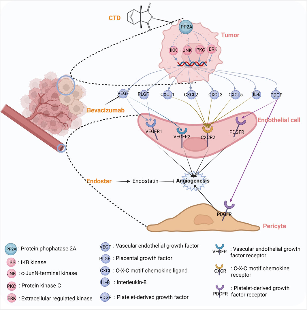 Several studies have also indicated that CTD may exert a pro-angiogenic effect on tumors. In pancreatic cancer, a study demonstrated that CTD significantly increased the size of transplanted tumors in nude mice. Consistent findings have also been reported in xenograft models of lung and colon cancers, indicating that CTD might promote tumor growth by enhancing angiogenesis in these malignancies. CTD can increase the levels of angiogenic factors, including vascular endothelial growth factor (VEGF), IL-6, IL-8, and TNF-α, and upregulate the expression of angiogenesis-related genes, including IL-8/C-X-C Motif Chemokine Ligand 8 (CXCL8), CXCL1/growth-related oncogene (GRO) -α, VEGF/VEGFA, granulocyte-macrophage colony-stimulating (GM-CSF)/colony stimulating factor 2 (CSF2), and plasminogen activator urokinase receptor (PLAUR)/uPAR at both the mRNA and protein levels. These findings suggest that CTD can stimulate tumor growth and potentially tumor vascular remodeling (Xu, 2019). Therefore, the antitumor effect of CTD may be masked by its angiogenic effect. However, the proangiogenic effects of CTD can be antagonized by anti-angiogenic drugs and kinase pathway inhibitors, such as, Bevacizumab, and Endostar, which exhibit significant synergistic antitumor effects. Figure 4 summarizes the synergistic mechanism of CTD and anti-angiogenic drugs. These results indicate that the clinical use of CTD to treat tumors should be conducted in conjunction with antiangiogenic therapy (Xu, 2019).