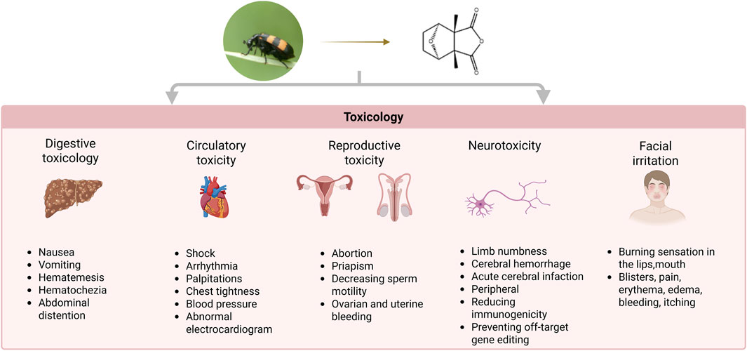 In the Chinese Pharmacopoeia, mylabris has been recorded to be extremely poisonous. Due to the lack of knowledge about its pharmacological effects, dosage, and toxicity, and lax drug management among users, there have been cases of toxicity due to multiple doses and accidental ingestion. The different administration routes and dosage forms of mylabris will affect the occurrence of toxic reactions. Mylabris poisoning mostly results from oral administration. There are differences in toxic reactions when decoctions and powders are used. The average toxic dose is 3.91 g in decoctions, with the minimum dose being 0.1 g and the maximum dose being 60 g. Mylabris toxicity generally occurs immediately after ingestion of the oral decoction. Sometimes, it occurred at 1 h after ingestion and led to death within 6 days. However, the intensity of toxicity is higher in the powder form, and is speculated to be related to the sublimation of CTD when exposed to high temperatures during decoction. Poisoning has also occurred in individuals coming in contact with external applications and during processing. Therefore, adequate protection must be ensure during preparation and use to avoid episodes of poisoning. In-depth studies have reported CTD to be the toxic component of mylabris. The characteristics of CTD poisoning are summarized in Figure 5 (Zhang et al., 2020a; Zhang, 2022).