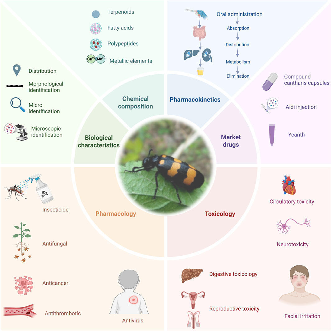 To address these challenges, this review provides, for the first time, a comprehensive synthesis of mylabris, encompassing its biological characteristics, chemical composition, pharmacological, toxicological, pharmacokinetics, and marketed drugs. We hope that this in-depth review could serve as a foundation for the rational development, safe clinical application, and future research on mylabris.