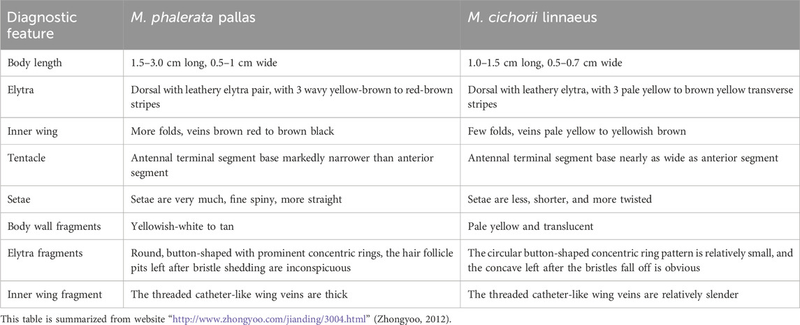 Mylabris belongs to the Meloidae family. There are more than 3,000 species in the 120 genera of Meloidae in the world wide, with more than 202 species in 26 genera reported in China alone (Wang, 2014). These species are distributed across most provinces and regions. Their distribution varies slightly. The vertical distribution ranges from low-altitude plains or hilly areas to high-altitude plateaus, for example, M. phalerata Pallas is mainly distributed in Jiangsu, Zhejiang, Hubei, Jiangxi, Fujian, Taiwan, Guangdong (Deng et al., 2017), and M. przewalskyi can be found at altitudes of up to 4,900 m. Additionally, the distribution of mylabris in a given area is positively correlated with the density of locusts and the types and quantities of legume crops (Mo et al., 2014). The medicinal species include M. phalerata Pallas and M. cichorii Linnaeus. Due to the high cost and limited availability, adulterated or counterfeit products are frequently encountered in the market.
