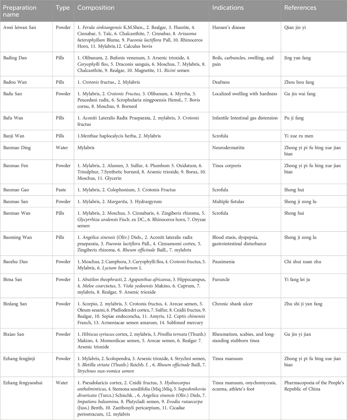 Ethnopharmacological applications of mylabris vary across different ethnic groups in China. Specifically, Tibetan practitioners use it to treat food stagnation, while the Li ethnic group employs it for facial hemiplegia and tonsillitis. In Uygur traditional medicine, it is prescribed for vitiligo, eczema, pruritus, rheumatism, and erectile dysfunction. Additionally, the Hmong people utilize it to manage lymphatic tuberculosis, scrofula, and rabies. The Manchu traditionally apply mylabris against malaria. Meanwhile, the Achang, Jingpo, and De’ang ethnic groups employ it therapeutically for managing bone fractures and hemorrhagic wouns (Liu et al., 2019).