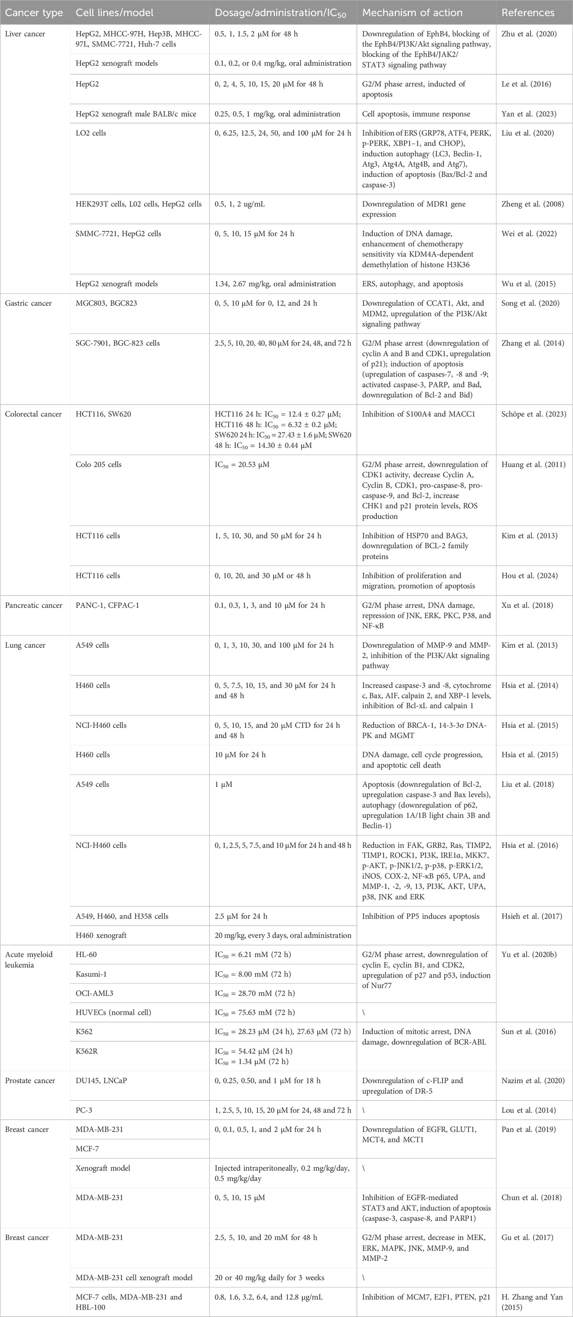 The medicinal use of mylabris for cancer was first documented by Yang Shiying, a renowned physician of the Southern Song Dynasty (Safenraiter et al., 2024). In 1980, CTD was identified as an active compound against liver cancer, and subsequent preclinical studies have since demonstrated its efficacy against multiple tumor types. Research on CTD’s antitumor properties remains more extensive than its other pharmacological activities (Li et al., 2018). Table 3 summarizes in vivo and in vitro models, dosages, and mechanistic insights underlying CTD’s anticancer effects.