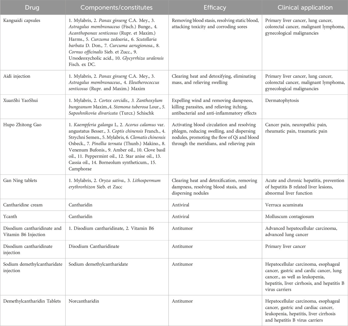 Mylabris possess notable medicinal value and is widely used in traditional Chinese medicine (TCM) formulations for treating diverse diseases (Table 2). Due to its toxicity, it is often used topically in the form of a powder (mixed with honey or vinegar) to treat carbuncles, boils, rhinitis, cough, and asthma. For oral administration, it is commonly roasted (with or without the removal of the head, feet, and wings) by cleaning or stir-frying with rice to reduce its toxicity and irritation, when treating scrofula, amenorrhea, and rabies (Ren et al., 2020). Nowadays, several prescriptions containing mylabris have been used in the form of tablet, injection, and capsules. Some prescriptions, such as Kangsaidi capsules, Aidi injection, and Ycanth, have been widely used.