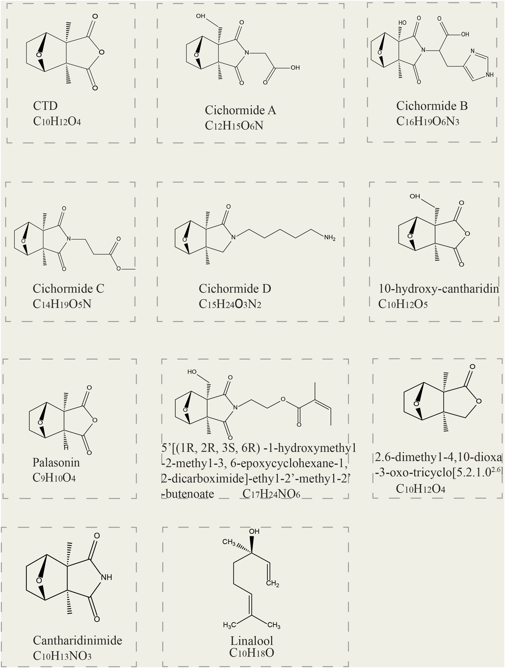 Two-dimensional structural formulas of 11 terpenoid constituents derived from mylabris.