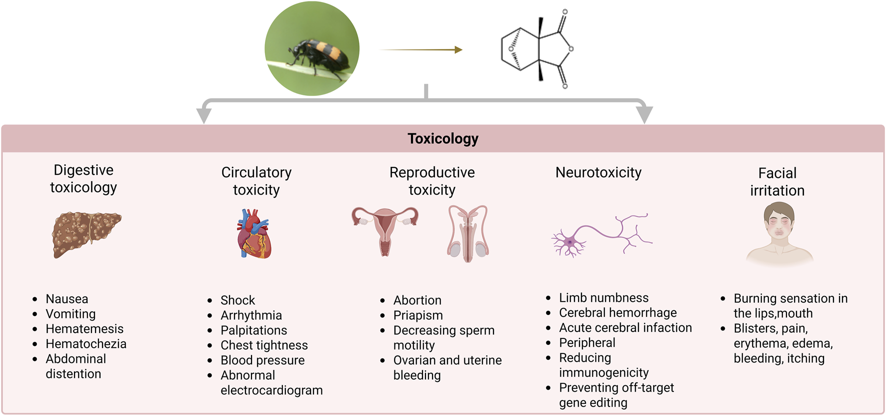 The major components of mylabris include terpenoids, metallic elements, fatty acids, and peptides. Pharmacological research have demonstrated its anticancer, antithrombotic, and antiviral effects in preclinical study, as well as insecticidal and antifungal in agriculture. Cantharidin is considered to be the main active and toxic component, which can cause gastrointestinal, cardiovascular and respiratory toxicity if used improperly. Pharmacokinetic studies reveal that orally cantharidin predominantly accumulates in the liver and kidneys, exhibiting strong irritancy and low bioavailability. Given its therapeutic efficacy, researchers have also developed various mylabris and cantharidin-based drugs in clinical setting.