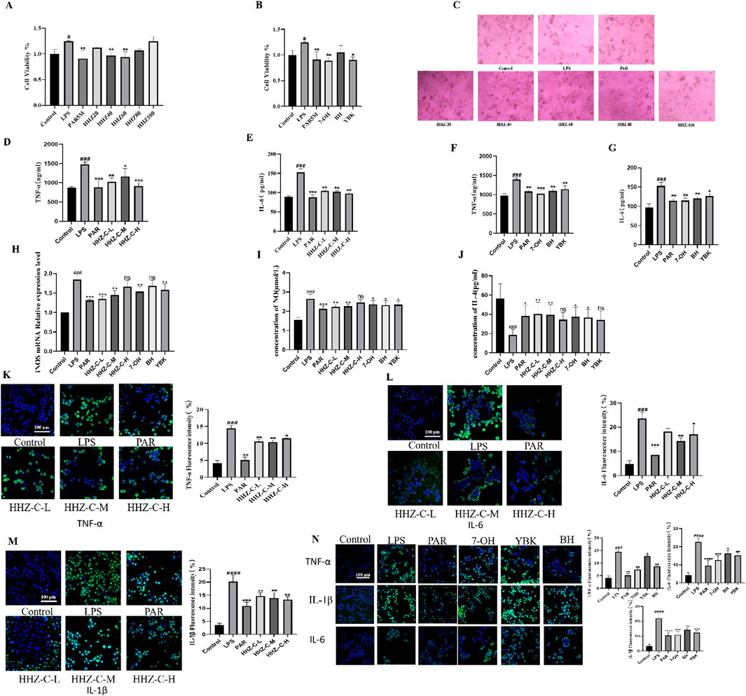 Figure 2. Protective effect of HHZ on LPS-induced inflammation in BV2 cells. (A,B) CCK-8 cell viability detection of HHZ extract and its active ingredient. (C) The effect of HHZ extract and LPS on the morphology of BV2 microglial cells (100X). (D–G) ELISA detection of TNF-α and IL-6 levels in BV2 cells. (H–J) After treatment with medicated serum, the expression levels of iNOS, NO, and IL-4 in BV2 cells. (K–N) Immunofluorescence analysis of TNF-α, IL-6, IL-1β. Values represent the mean ± SD. #p < 0.05, ##p < 0.01, ###p < 0.001, ####p < 0.0001 means significant difference compared with the control group; *p < 0.05, **p < 0.01, ***p < 0.001, ****p < 0.0001 means significant difference compared with LPS group.