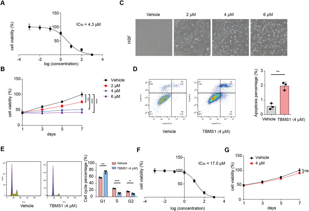 Figure 1. TBMS1 inhibited the proliferation of HSFs. (A) IC50 of TBMS1 for suppressing the proliferation of HSFs. (B) HSF viability following vehicle or TBMS1 treatment. (C) Cell morphology of HSFs following 48 h of treatment with vehicle or TBMS1 at various doses. (D) Flow cytometry and cell apoptosis analyses of HSFs treated with vehicle or TBMS1 (n = 3 separate assays). (E) Flow cytometry and cell cycle analyses of HSFs following treatment with vehicle or TBMS1 (n = 3 separate assays). (F) IC50 of TBMS1 for suppressing NSF proliferation. (G) NSF viability was assessed following vehicle or TBMS1 treatment (4 μM) (n = 3 separate assays). The data suggest mean ± SD. Assay (B) was examined by one-way ANOVA with Tukey’s multiple comparison test, whereas assays (D), (E), and (F) were examined through unpaired two-tailed Student’s t tests; *P < 0.05, **P < 0.01, and ***P < 0.001.