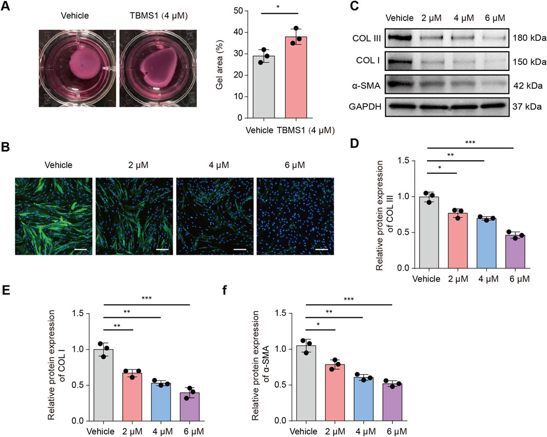Figure 3. TBMS1 restrained HSF fibrotic phenotypes. (A) Representative images and collagen gel contraction quantitative analyses for the vehicle and TBMS1 groups (n = 3 separate assays). (B) Immunofluorescence analysis revealed α-SMA staining in vehicle-treated or TBMS1-treated HSFs; scale bar = 100 µm. (C–F) Western blotting was performed for determining COL I, COL III, and α-SMA contents of HSFs treated with vehicle or TBMS1. The data suggest mean ± SD. Experimental data (C–F) were examined via one-way ANOVA with Tukey’s multiple comparison test, whereas experimental data (A) were analyzed via an unpaired two-tailed Student’s t-test; *P < 0.05, **P < 0.01, and ***P < 0.001.