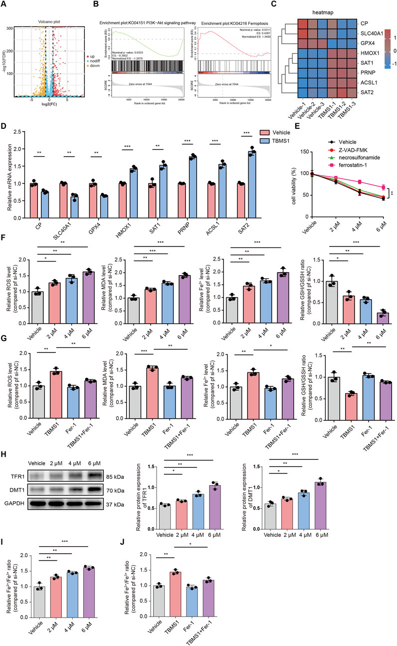 Figure 4. TBMS1 caused HSF ferroptosis. (A) The volcano plot displays significantly differentially-expressed genes (DEGs) in TBMS1-treated HSFs. (B) GSEA of DEGs in TBMS1-treated HSFs. Pathways related to PI3K/AKT pathway and ferroptosis are presented. (C) The heatmap shows typical TBMS1-regulated ferroptosis genes in HSFs. (D) The expression of the mRNAs of DEGs associated with ferroptosis in HSFs treated with vehicle or TBMS1 was estimated by qRT-PCR. (E) HSFs were treated with TBMS1 or TBMS1 combined with 1 µM ferrostatin-1, 10 µM Z-VAD-FMK, or 1 μM necrosulfonamide for 48 h before the measurement of cell viability (n = 3 separate assays). (F) ROS and MDA levels, intracellular Fe2+ contents, and the GSH/GSSG ratio in vehicle-treated or TBMS1-treated HSFs (n = 3 separate assays). (G) ROS and MDA levels, intracellular Fe2+ contents, and GSH/GSSG ratio of HSFs after treatment with TBMS1 or TBMS1 combined with ferrostatin-1 (1 µM) (n = 3 separate assays). (H) Western blotting illustrated TFR1 and DMT1 levels within HSFs after vehicle or TBMS1 treatment. (I) the Fe2+/Fe3+ ratio in vehicle-treated or TBMS1-treated HSFs (n = 3 separate assays). (J) the Fe2+/Fe3+ ratio of HSFs after treatment with TBMS1 or TBMS1 combined with ferrostatin-1 (1 µM) (n = 3 separate assays). The data suggest mean ± SD. Experiments (E–J) were examined via one-way ANOVA based on Tukey’s multiple comparison test, whereas assay (D) was performed via an unpaired two-tailed Student’s t-test; *P < 0.05, **P < 0.01, and ***P < 0.001.