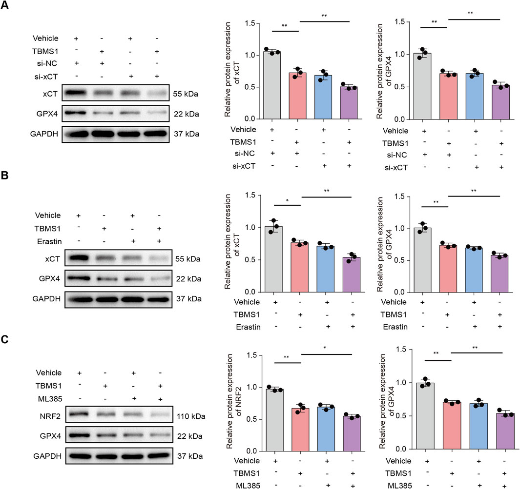 Figure 6. TBMS1 induced ferroptosis in HSFs by regulating NRF2/xCT/GPX4 pathway. (A) The x-CT, and GPX4 protein levels in HSFs under TBMS1 or TBMS1 combined with si-xCT treatment. (B) The x-CT, and GPX4 protein levels in HSFs under TBMS1 or TBMS1 combined with Erastin (5 μM) treatment. (C) The NRF2, and GPX4 protein levels in HSFs under TBMS1 or TBMS1 combined with ML385 (5 μM) treatment. The data suggest mean ± SD. Experiments (A–C) were examined via one-way ANOVA based on Tukey’s multiple comparison test; *P < 0.05, **P < 0.01, and ***P < 0.001.
