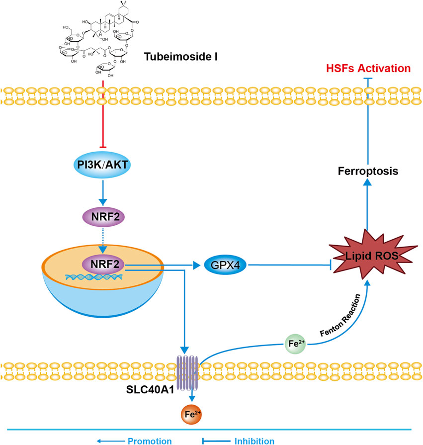 To summarize, TBMS1 inhibited HS by triggering myofibroblast ferroptosis via the PI3K/AKT/NRF2-ferroptosis pathway (Figure 8). These results support the use of TBMS1 as a PI3K/AKT signaling pathway inhibitor and ferroptosis inducer, which may be translated to treat HS.
