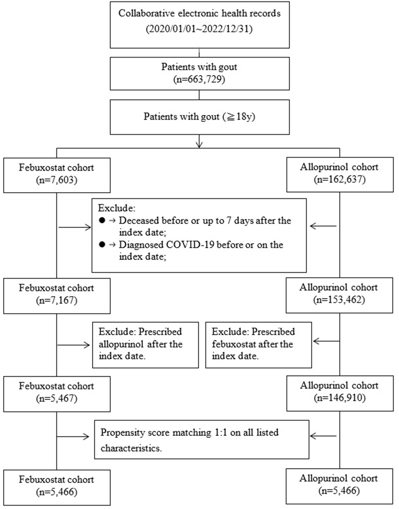 A total of 663,729 patients with gout were enrolled between January1, 2020 and December31, 2022 from 35,528,077 participants in collaborative electronic health records with at least two visits. People aged≥18 years diagnosed with gout [ICD10 = M10, M1A] were included in the cohort (n = 630,596). In addition, two groups of participants were selected: 7,603 gout patients with Febuxostat [Anatomical Therapeutic Chemical, ATC code M04AA03, at least prescribed twice] and 162,637 gout patients with Allopurinol [ATC code M04AA01, at least prescribed twice]. The index date was the date of the first prescription during the study period. Patients diagnosed COVID-19 or deceased before or up to 7 days after the index date were excluded. Moreover, for the Febuxostat cohort, prescribed Allopurinol after the index date (switchers)and for the Allopurinol cohort, prescribed febuxostat after the index date (switchers) were also excluded. After exclusion, 5,467 patients with Febuxostat and 146,910 patients with Allopurinol in the comparison group were selected.