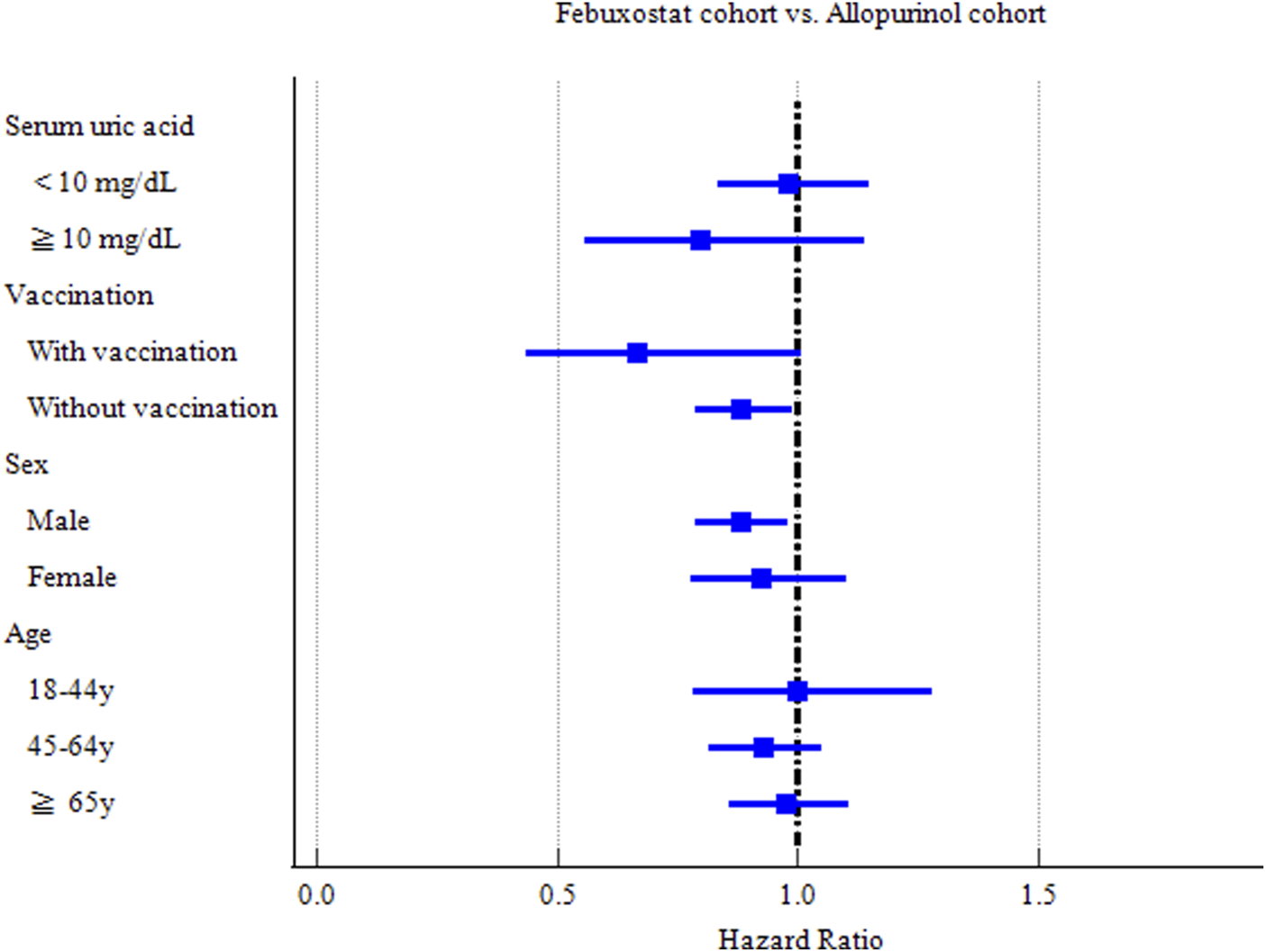 Compared to Allopurinol group, Febuxostat significantly reduced the risk of COVID-19 incidence (HR = 0.878 [0.801–0.963]) and hospitalization (HR = 0.874 [0.772–0.989]). Febuxostat appears to be more effective in male, elder, without record of COVID-19 vaccination, and gout patients with serum uric acid<10 mg/dL in reducing the risk of COVID-19 infection. In addition, Febuxostat markedly reduced the hospitalization (HR = 0.652 [0.485–0.877]) in gout patients due to renal impairment or with tophus and the risks of COVID-19 incidence (HR = 0.878 [0.801–0.963]).
