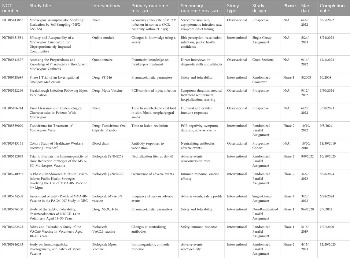 Public health preparedness was another key focus. The pharmacist preparedness study (NCT05543577) revealed gaps in knowledge regarding Mpox diagnosis and management, stressing the need for targeted educational interventions. Similarly, the efficacy and acceptability study on an online Mpox curriculum (NCT05651581) found that structured educational modules significantly improved awareness and vaccine acceptance among high-risk populations. Vaccine-related studies, such as the evaluation of JYNNEOS (NCT05512949) and the Imvanex® cohort study (NCT03745131), provided valuable data on immunogenicity and safety. These findings are instrumental in refining vaccination strategies, particularly concerning dose reduction to enhance vaccine accessibility without compromising efficacy.