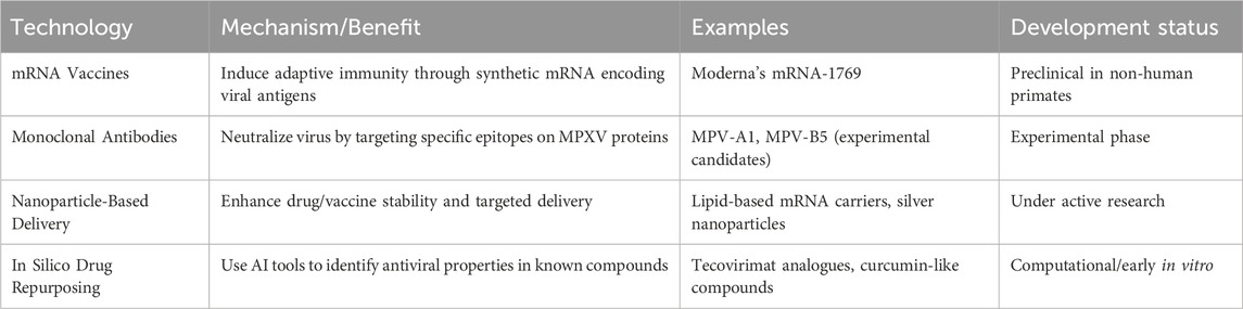 The resurgence of Mpox as a global health concern has intensified the search for effective therapeutic strategies. Traditional treatments have focused on symptom management and the repurposing of existing antivirals as the major approaches. However, the limitations of these very approaches have spurred the exploration of next-generation therapies (Table 3). Given the success of mRNA technology in COVID-19 vaccines, researchers have started to study various mRNA-based vaccines for Mpox. Moderna’s mRNA vaccine candidate, namely mRNA-1769, was successful in preventing the disease in preclinical studies, displaying a reduction in disease severity and duration in macaque models (Cotter et al., 2024). Macaques that received the mRNA vaccine exhibited fewer symptoms, including weight loss and lesions, and had lower viral loads and a shorter disease duration compared to those that received the MVA vaccine (Mucker et al., 2024). This approach allows for rapid vaccine development and scalability, crucial during outbreak scenarios.