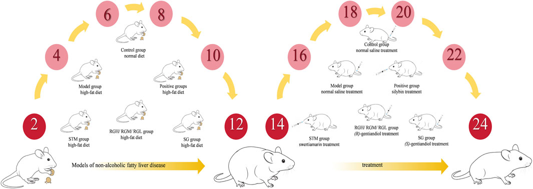 The normal diet for rats was purchased from Changsheng Biotechnology Company (Liaoning, China). The high-fat diet for rats was self-produced (ingredients: 77.5% normal diet, 10% yolk powder, 10% lard, 2% cholesterol, 0.5% bile salt). Silybin was purchased from Tianshili Shengte Pharmaceutical Company (Tianjin, China). Acetonitrile (UPLC grade) and formic acid (UPLC grade) were purchased from Merck Group (Darmstadt, Germany). Swertiamarin (STM, chemical formula C16H22O10, molecular weight 374.43, Cat. CAS 17388–39-5) at 98.04% purity was obtained from the Master of Bioactive Molecules. RG and SG were synthesized as previously described (Z. G. Wang et al., 2012). The assay kits for total cholesterol (TC), triglyceride (TG), alanine aminotransferase (ALT), aspartate aminotransferase (AST), low-density lipoprotein cholesterol (LDL-C), high-density lipoprotein cholesterol (HDL-C), malondialdehyde (MDA), superoxide dismutase (SOD), and glutathione peroxidase (GSH-PX) were acquired from Nanjing Jiancheng Biological Engineering Institute (Nanjing, China). Milli-Q ultrapure water system (Billerica, USA) was used for purifying distilled water. Ammonia, hydrochloric acid, chloroform, petroleum benzene, sodium sulfite, ethyl acetate, and asymmetric dihydroxylation (AD) mixtures were acquired from Sigma Chemical (St. Louis, MO, USA).