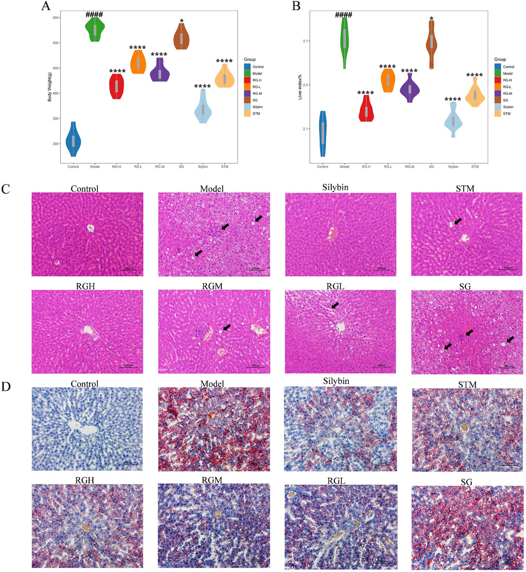 The three herbal monomer extracts were administered to rats continuously for 12 weeks, and the rats remained healthy, active, and did not die during the study. As shown in Figure 3A, the body weight of the NAFLD model group apparently increased (P < 0.01) in comparison with that of the control group, whereas the body weight gradually decreased after treatment with STM, RGH, RGM, and RGL. The RGH group exhibited the most significant improvement, while no significant decrease was noted in the SG group.