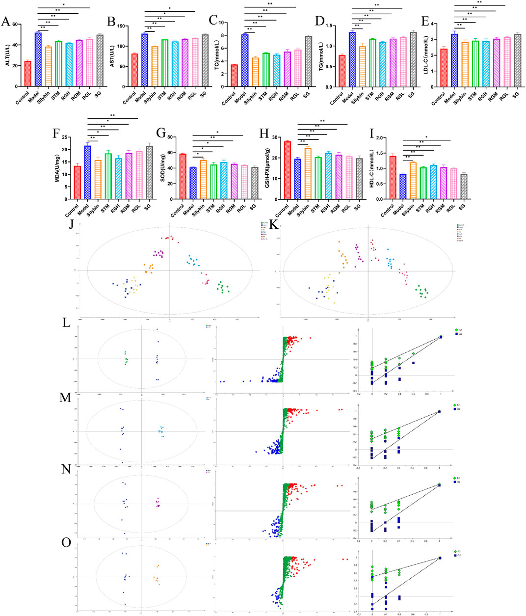 Figure 4. Biochemical indexes result of NAFLD model rats after administration of treatment in each group. (A–I) Biochemical parameters of serum ALT, AST, TC, TG, LDL-C, MDA, SOD, GSH-PX and HDL-C in the control, model, STM, RGH, RGM, RGL, SG and Silybin groups. *p < 0.05, **p < 0.01 represent data vs. the model group. (J) PLS-DA 2D score plots for eight groups of sera in ESI+. (K) PLS-DA 2D score plots for eight groups of sera in ESI−. (L–O) The OPLS-DA score plot, S-plot and corresponding coefficient of loading plots between the control and model groups; the RGH and model groups; the RGM and model groups; the RGL and model groups.