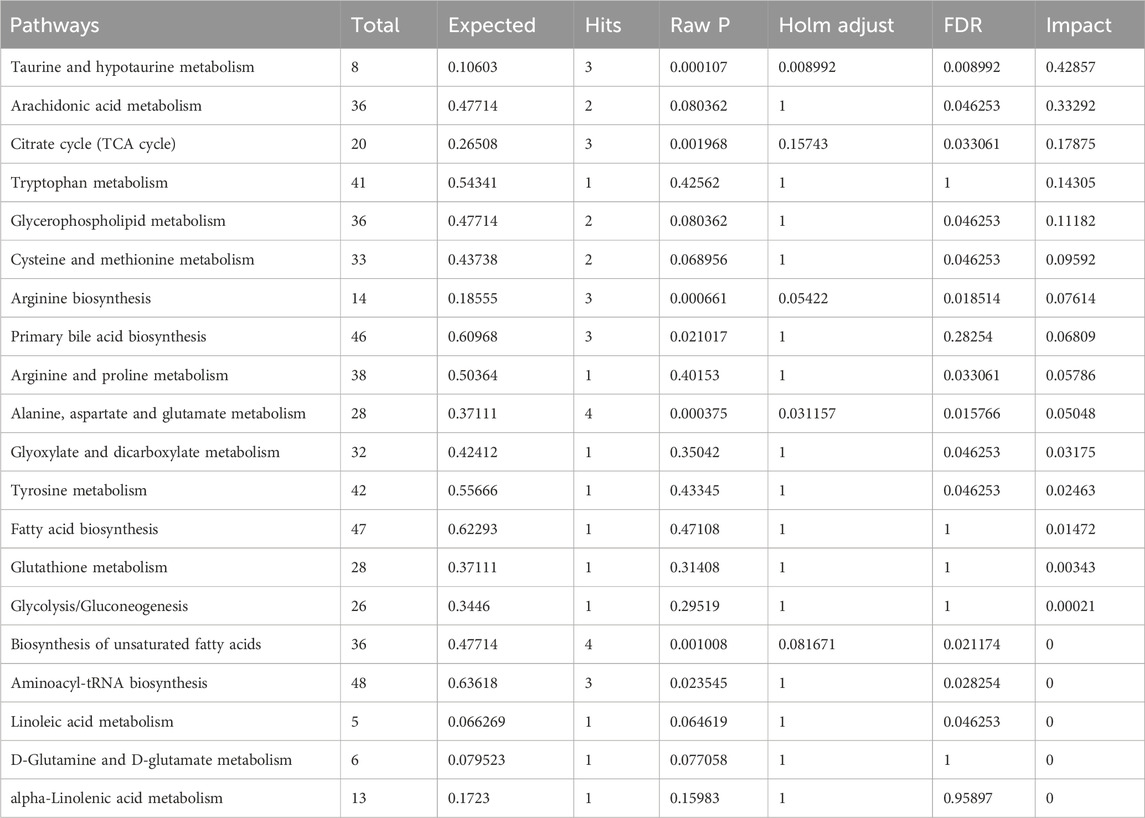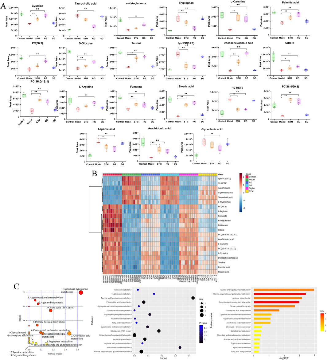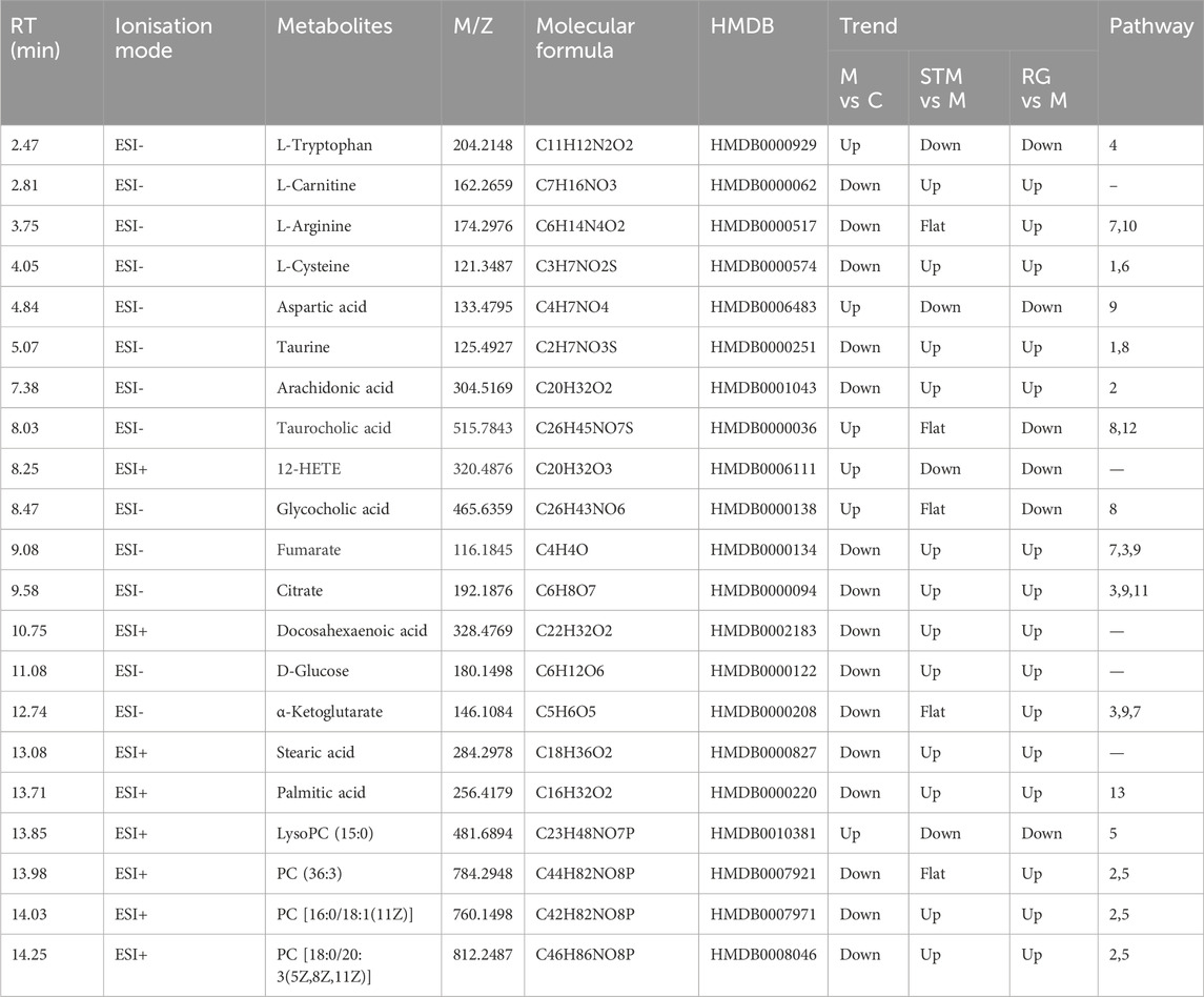 A total of 21 differentially abundant metabolites were detected. Biomarker information and levels are presented in Table 2. Figures 5A,B shows the changes in the levels of 21 differential metabolites in each group along with a heatmap. Compared to those in the control group, the levels of lipid metabolites such as 12-HETE and lysoPC (15:0) were significantly increased, and the levels of docosahexaenoic acid, stearic acid, palmitic acid, PC (36:3), PC (16:0/18:1(11Z)), PC (18:0/20:3(5Z,8Z,11Z)), and arachidonic acid metabolites were significantly decreased. Moreover, arachidonic acid metabolites were significantly downregulated; the levels of amino acid metabolites such as L-tryptophan, aspartic acid were significantly upregulated, as well as L-arginine, L-cystine, and taurine were significantly decreased, the levels of bile acid metabolites taurocholic acid, and glycocholic acid were significantly increased, and the levels of D-glucose and L-carnitine were significantly decreased compared to the control group. Seventeen differential metabolites were regulated after STM. Twenty-one differential metabolites were regulated after RG. The therapeutic effect of SG on abnormal metabolites converged in the model.
