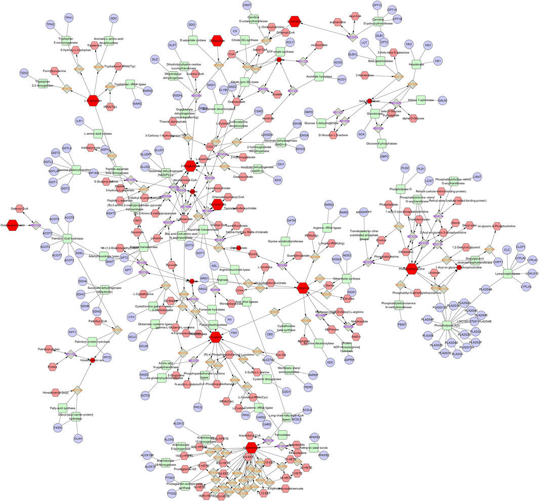 Figure 6. The metabolic network diagram. Blue represents the relevant target, pink represents other metabolites in this pathway, and red represents the differential metabolites identified in this experiment.
